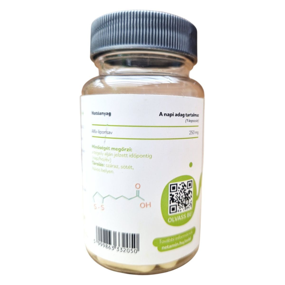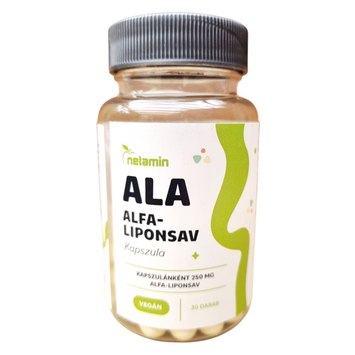 A Netamin Alfa-liponsav kapszula egy 100% vegán étrend-kiegészítő, amely kapszulánként 250 mg alfa-liponsavat tartalmaz. Az alfa-liponsav antioxidáns tulajdonságai révén hozzájárulhat a szervezet egészségének támogatásához. A termék mikrokristályos cellulózt és növényi kapszulahéjat tartalmaz, és csomósodást gátló anyagokkal van kiegészítve. A kapszulák napi egy alkalommal, lehetőleg két étkezés között javasoltak. Fontos, hogy az ajánlott napi adagot ne lépje túl, és az étrend-kiegészítő nem helyettesíti a vegyes étrendet és az egészséges életmódot. A terméket száraz, sötét, hűvös helyen kell tárolni, és gyermekek elől elzárva tartani. A terméket a Natural Herbal Kft. forgalmazza.