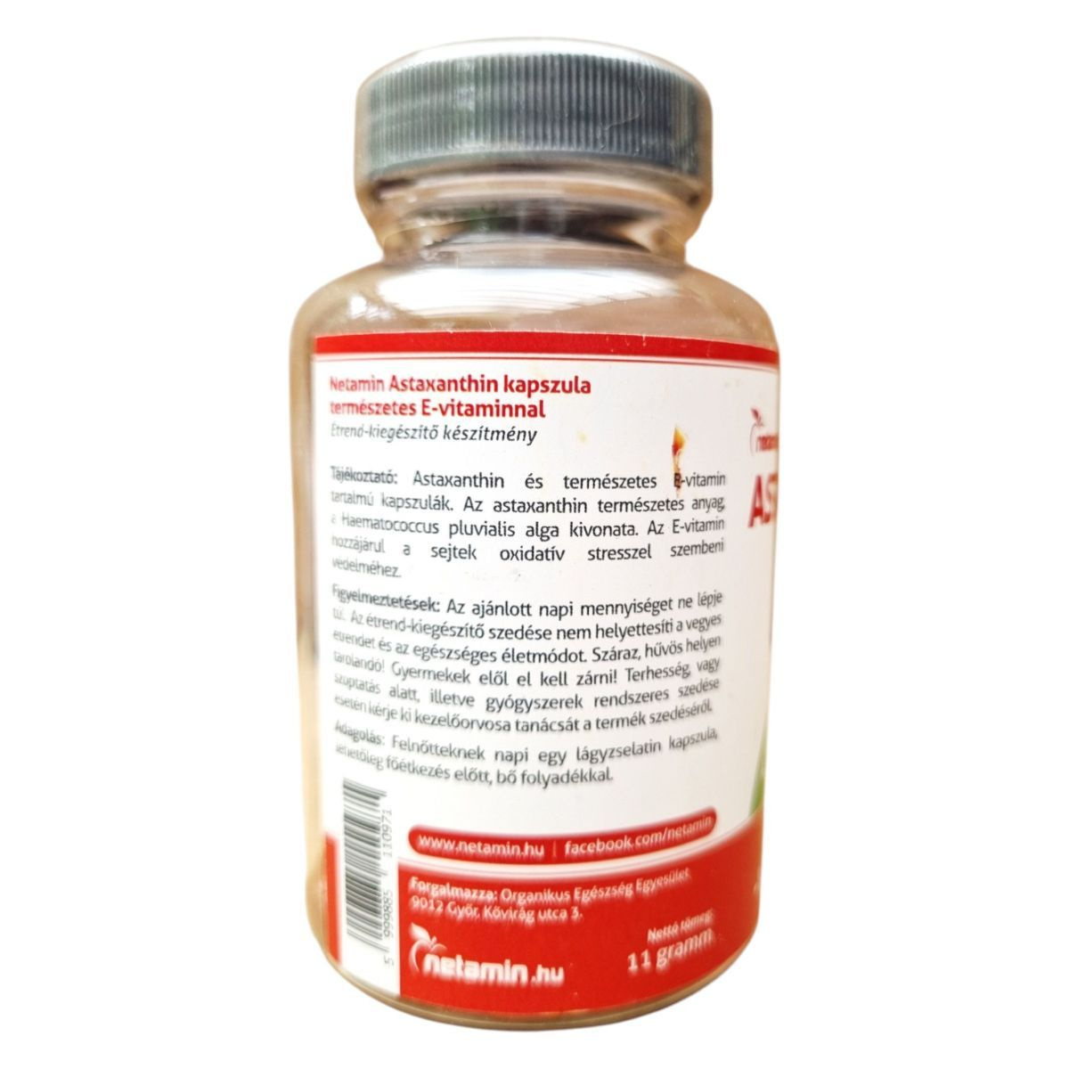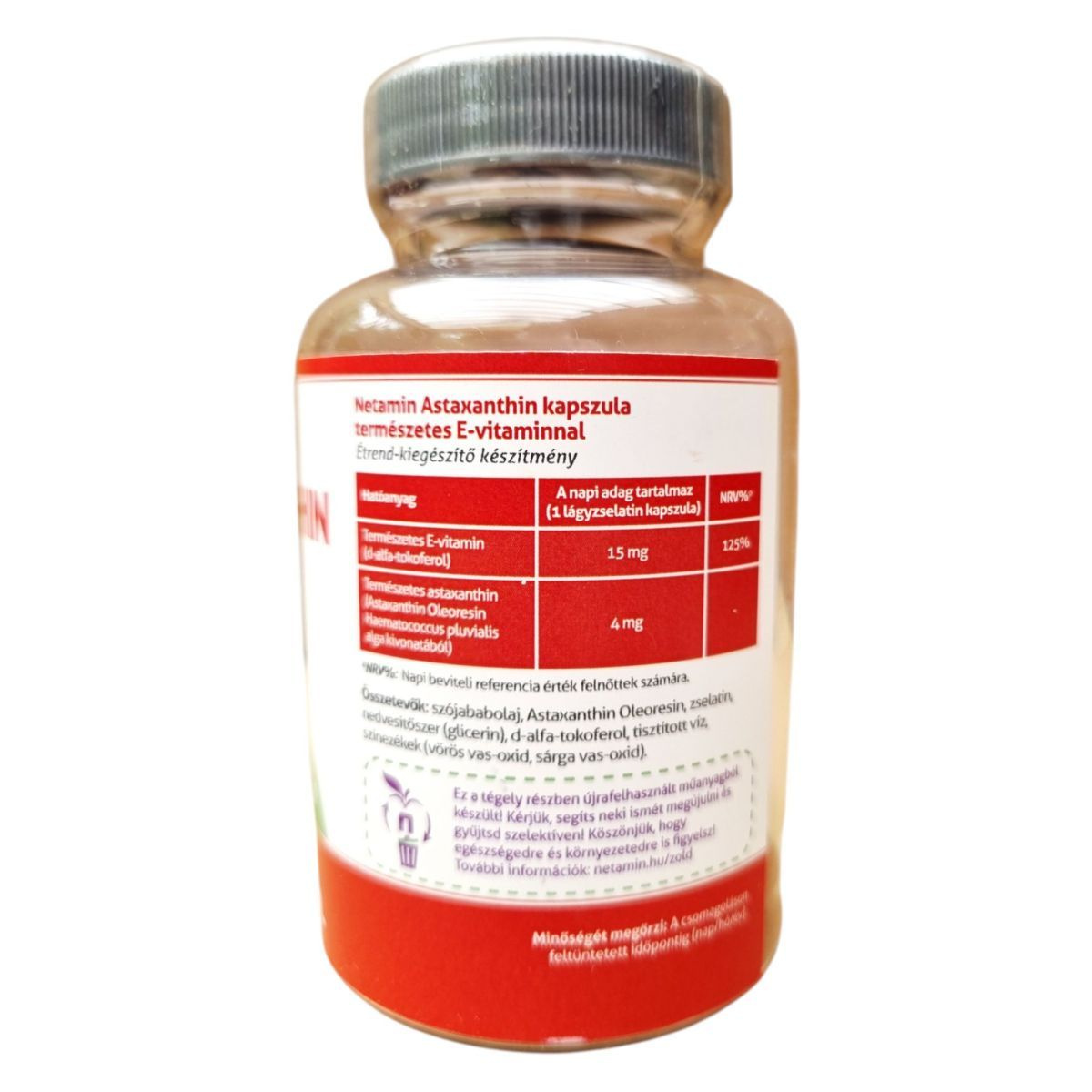 A Netamin Astaxanthin kapszula természetes E-vitaminnal kiegészítve készült, amely hozzájárulhat a sejtek oxidatív stresszel szembeni védelméhez. Az astaxanthin a Haematococcus pluvialis alga kivonatából származik, és a termék bio étrendi irányzatot követ. A kapszulák összetevői között megtalálható a szójaolaj, zselatin, glicerin, valamint színezékek, mint a vörös és sárga vas-oxid. A termék csomagolása részben újrafelhasznált műanyagból készült, így környezetbarát megoldást kínál. A termék fogyasztása során fontos betartani az ajánlott napi mennyiséget, és figyelembe venni a figyelmeztetéseket, különösen terhesség vagy szoptatás alatt, illetve gyógyszerek rendszeres szedése esetén.
