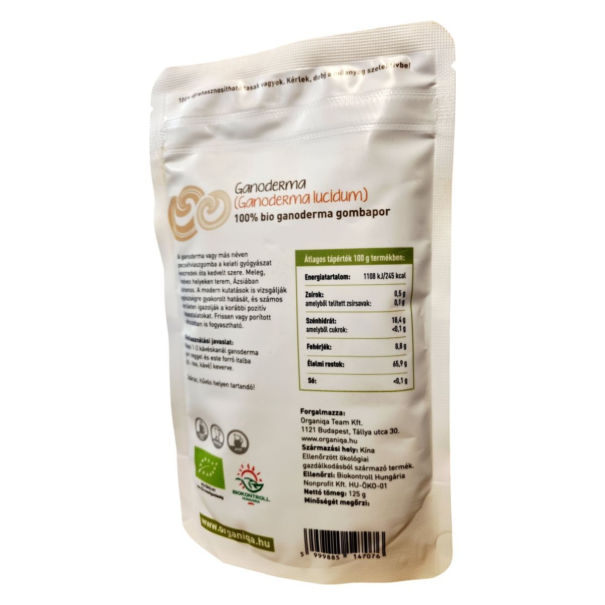 A Ganoderma por, más néven pecsétviaszgomba, Ázsiában őshonos, meleg, nedves helyeken terem. A termék 100% bio ganoderma gombaport tartalmaz, amelyet ellenőrzött ökológiai gazdálkodásból származó alapanyagokból készítenek. A tasak 100% újrahasznosítható, így környezetbarát választás. A terméket a Biokontroll Hungária Nonprofit Kft. ellenőrzi, és a származási helye Kína. A termék forgalmazója az Organiqa Team Kft., amelynek székhelye Budapest, Tállya utca 30.