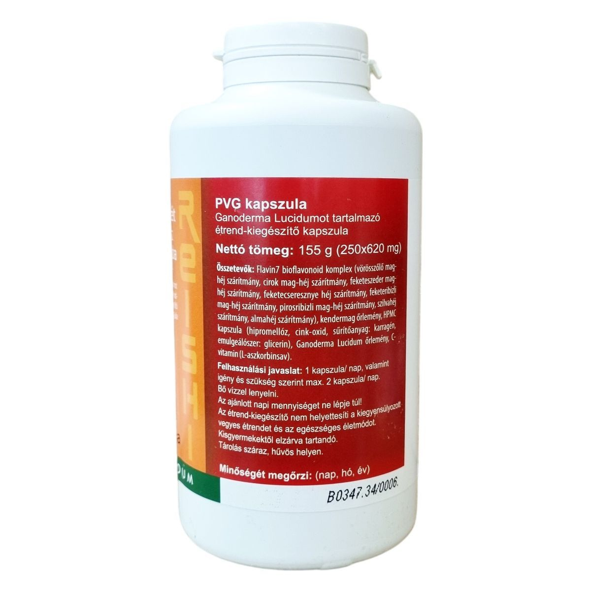 A PVG kapszula a Ganoderma Lucidum (pecsétviaszgomba) erejét ötvözi a Flavin7 komplex különleges bioflavonoidjaival. A készítmény gazdag poliszacharidokban, polifenolokban és aminosavakban. A speciális HPMC kapszulahéj vegetáriánusok számára is megfelelő választás lehet. A termék nettó tömege: 155 g (250 x 620 mg).
