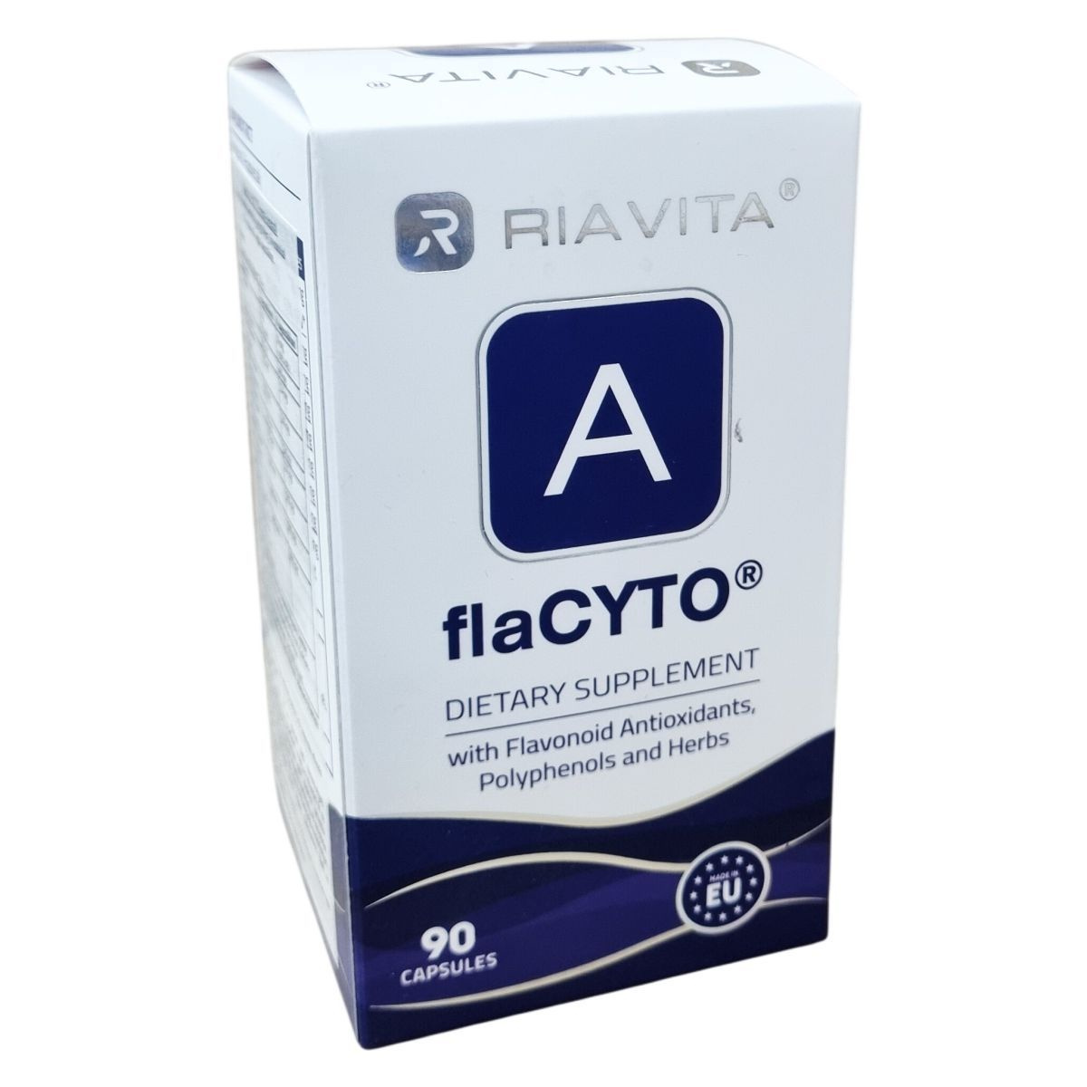 A Riavita A-flaCYTO étrend-kiegészítő kapszulái flavonoid antioxidánsokat, polifenolokat és gyógynövény kivonatokat tartalmaznak, amelyeket vegán kapszulába zártak. A termék összetevői között szerepel többek között E-vitamin, brokkoli-, kerti katicavirág-, japánakác-, zöld tea-, kamilla-, máriatövis-, és Panax ginseng kivonat, valamint gyümölcskivonatok keveréke. A kapszula anyaga hipromellóz, kiegészítő összetevőként pedig lenmag-, lucerna-, kurkuma-, paradicsom-, bodzavirág- és gyömbér-kivonatok találhatók. A készítmény Magyarországon készült az Európai Unióban, és GMP tanúsítvánnyal rendelkezik, emellett nem tartalmaz GMO-t vagy titán-dioxidot. Fontos, hogy az ajánlott adagolást ne lépjék túl, és hogy az étrend-kiegészítő nem helyettesíti a kiegyensúlyozott étrendet és az egészséges életmódot.