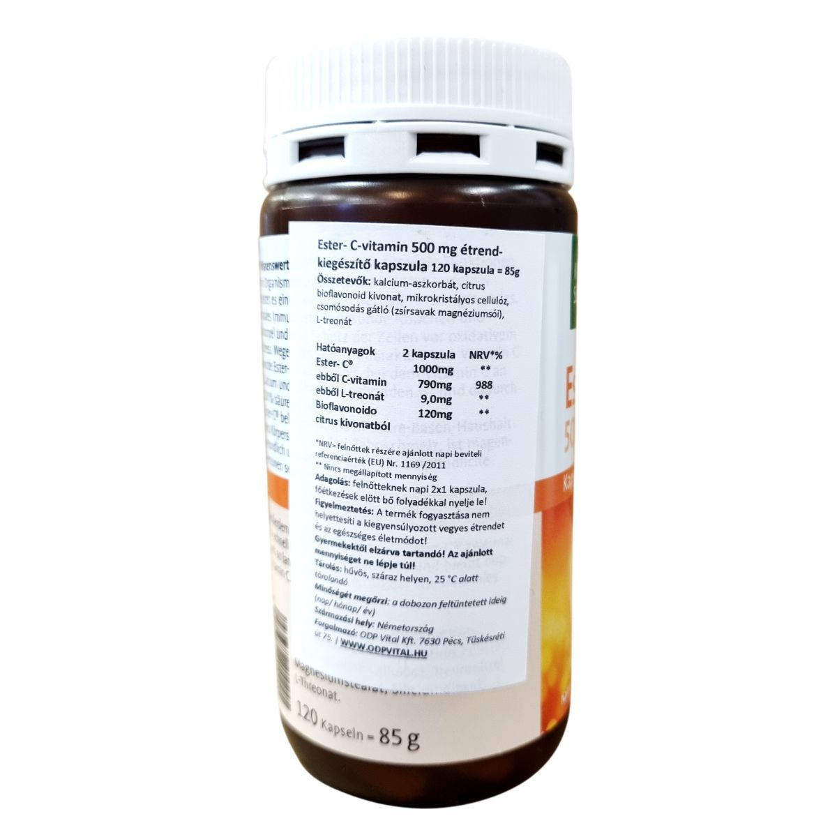 Az Ester-C® kapszula egy étrend-kiegészítő készítmény, melyben a C-vitamin egy speciális, kalcium-aszkorbát formában van jelen, kiegészítve L-treonáttal és citrus bioflavonoid kivonattal. A termék porciózott adagolásban, kapszula formában készül és 120 kapszulát tartalmaz, összesen 85 gramm súlyban. A termék színtiszta, minőségét megőrzi a dobozon jelzett időpontig. A kapszulát legfeljebb 25 °C-on, száraz, fénytől védett helyen kell tárolni. Gyártási helye Németország, forgalmazója az ODP Vital Kft. A termék nem helyettesíti a változatos és kiegyensúlyozott étrendet, valamint az egészséges életmódot, ezért annak részeként használata ajánlott. A készítményt gyermekektől elzárva kell tartani, és a javasolt adagolás pontos betartása fontos.