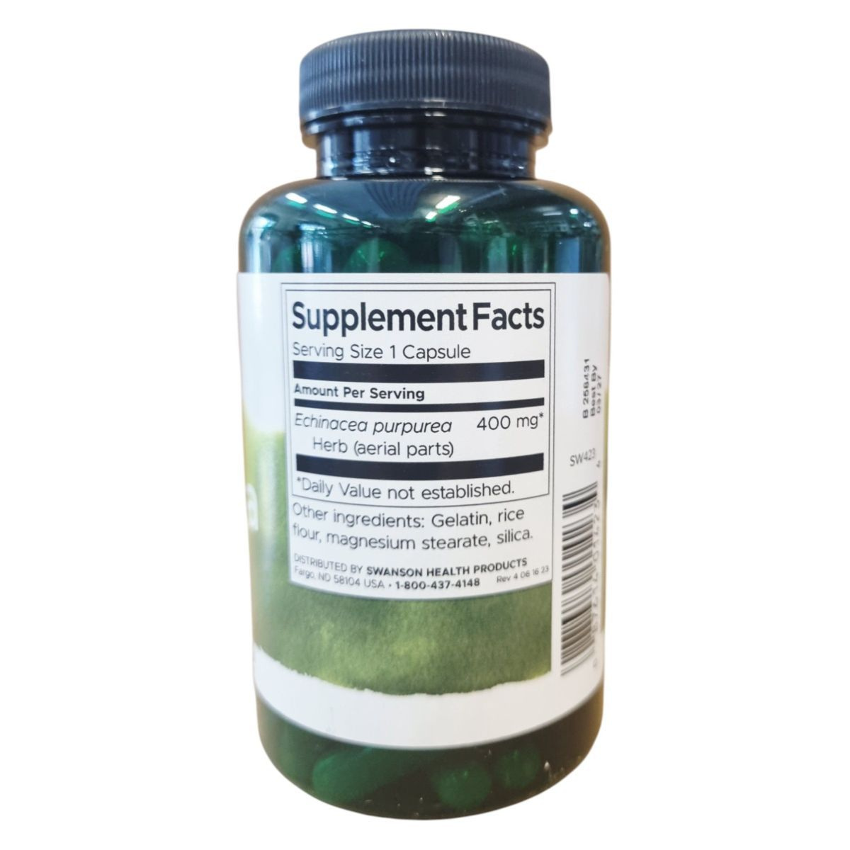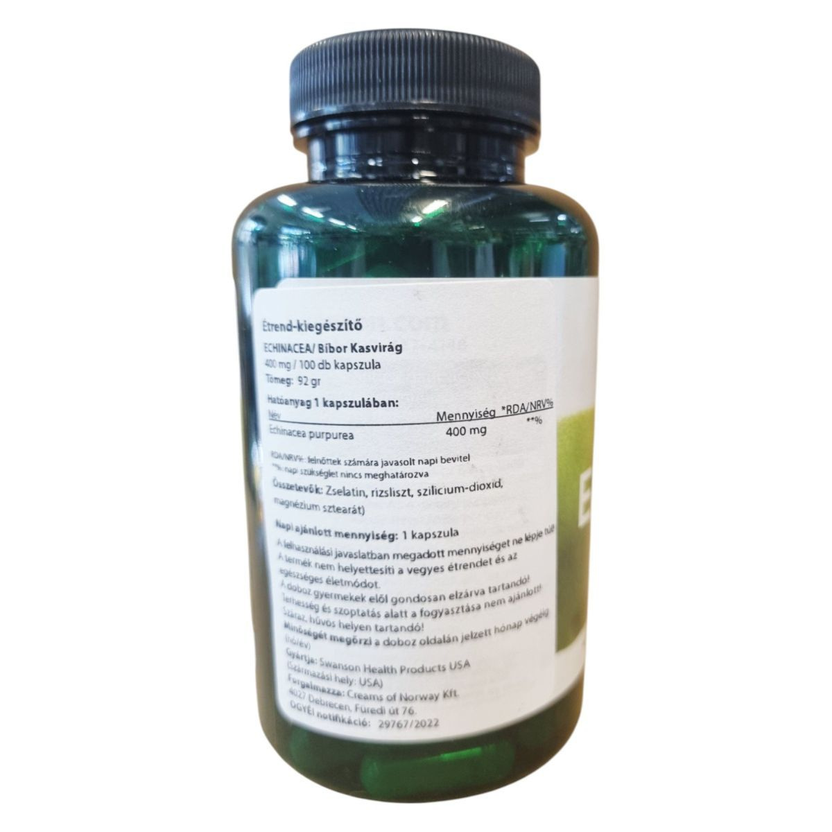 A Swanson Echinacea étrend-kiegészítő 100 kapszulás kiszerelésben kapható, és kapszulánként 400 mg Echinacea purpurea-t tartalmaz. Az echinacea, más néven bíbor kasvirág, hozzájárulhat az immunrendszer támogatásához. A termék összetevői között megtalálható a zselatin, rizsliszt, szilícium-dioxid és magnézium-sztearát. Az étrend-kiegészítő nem helyettesíti a vegyes étrendet és az egészséges életmódot, és terhesség, valamint szoptatás alatt nem ajánlott a fogyasztása. A terméket száraz, hűvös helyen kell tárolni, és gyermekek elől elzárva tartani. A Swanson Health Products által gyártott terméket a Creams of Norway Kft. forgalmazza Magyarországon.