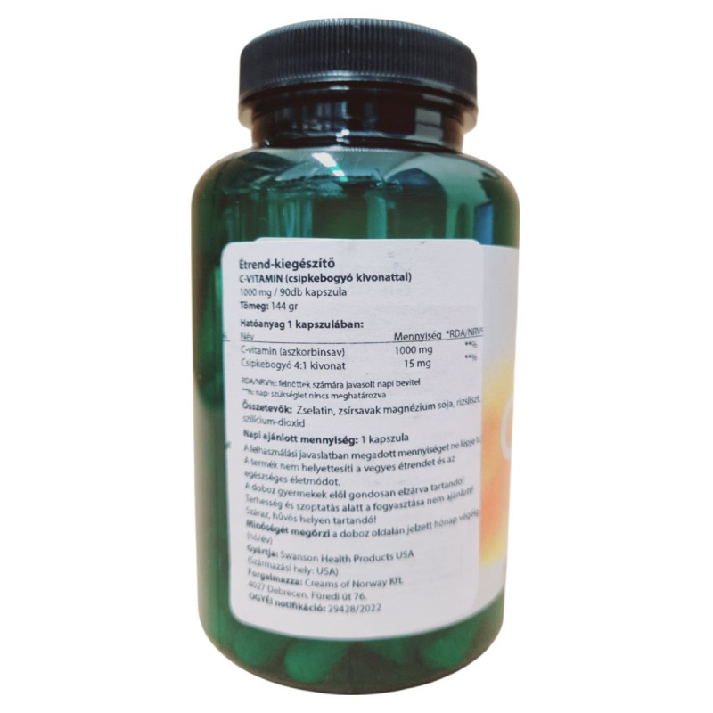 A Swanson C-Vitamin csipkebogyó kivonattal egy étrend-kiegészítő, amely 1000 mg C-vitamint és 15 mg csipkebogyó kivonatot tartalmaz kapszulánként. A termék célja, hogy támogassa az immunrendszert és antioxidáns védelmet nyújtson. A kapszulák zselatinból készülnek, és további összetevőik közé tartozik a zsírsavak magnézium sója, rizsliszt és szilícium-dioxid. A termék használata nem ajánlott terhesség és szoptatás alatt. A Swanson Health Products által gyártott terméket a Creams of Norway Kft. forgalmazza Magyarországon.