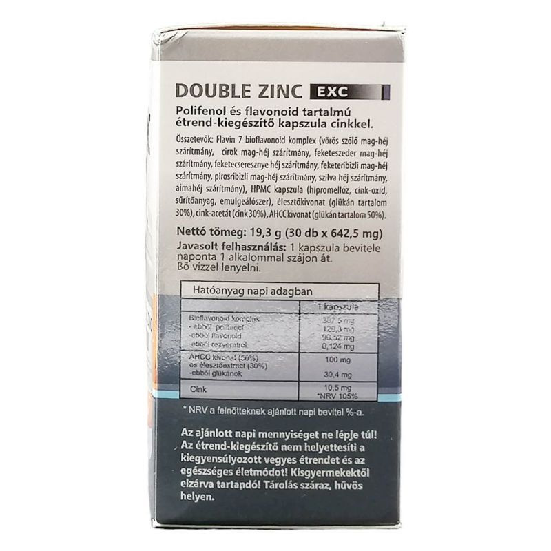 Hatóanyag napi adagban (1 kapszula): bioflavonoid komplex: 387,5 mg -ebből polifenol: 129,3 mg -ebből flavonoid: 90,52 mg -ebből rezveratrol: 0,124 mg, AHCC kivonat (50%) és élesztőextract (30%): 100 mg -ebből glükánok: 30,4 mg, cink: 10,5 mg.