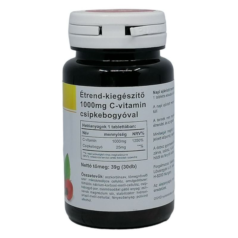 A C-vitamin hozzájárul a normál kollagén képződéshez és ezen keresztül az alábbi funkciókhoz: az erek normál állapotának, működésének fenntartásához. a normál csontozat fenntartásához. a porcok normál állapotának, működésének fenntartásához. a fogíny normál állapotának fenntartásához. a bőr normál állapotának, működésének fenntartásához. a fogak normál állapotának fenntartásához. OÉTI bejegyzési szám: 6449/2010. Napi ajánlott mennyiség: 1 tabletta. A felhasználási javaslatban megadott mennyiséget ne lépje túl! A termék nem helyettesíti a vegyes étrendet és az egészséges életmódot. A doboz gyermekek elől gondosan elzárva tartandó!