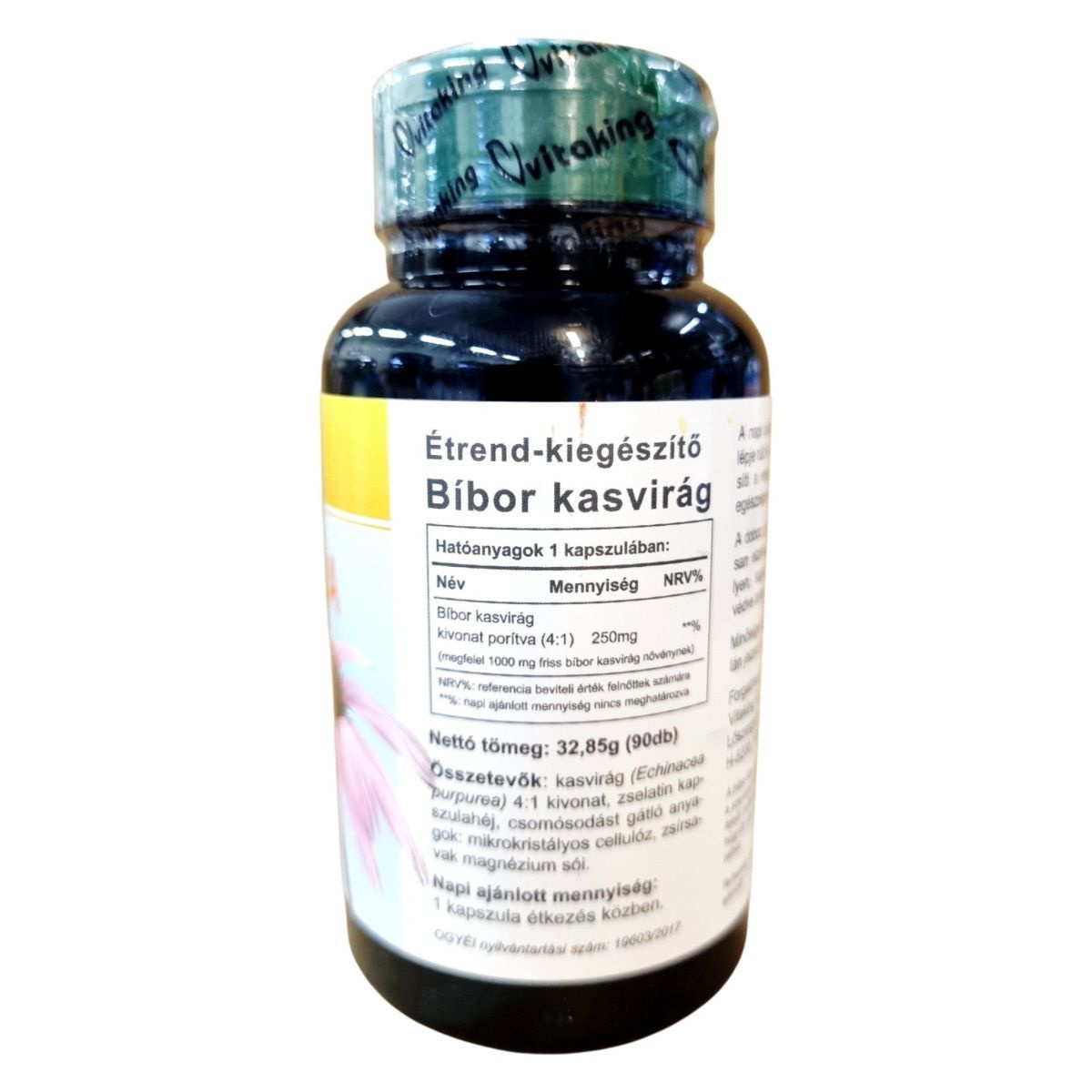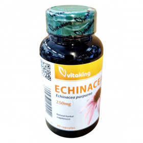 A Vitaking Echinacea étrend-kiegészítő bíbor kasvirág kivonatot tartalmaz, amelyet hagyományosan a szervezet védekező rendszerének támogatására használnak. A termék 90 kapszulát tartalmaz, és minden kapszula 250 mg bíbor kasvirág kivonatot biztosít, amely megfelel 1000 mg friss növénynek. Az étrend-kiegészítő nem helyettesíti a vegyes étrendet és az egészséges életmódot, és terhesség, valamint szoptatás alatt nem ajánlott a fogyasztása. A terméket a Vitaking Kft. forgalmazza, és az OGYÉI nyilvántartási száma 19063/2017.