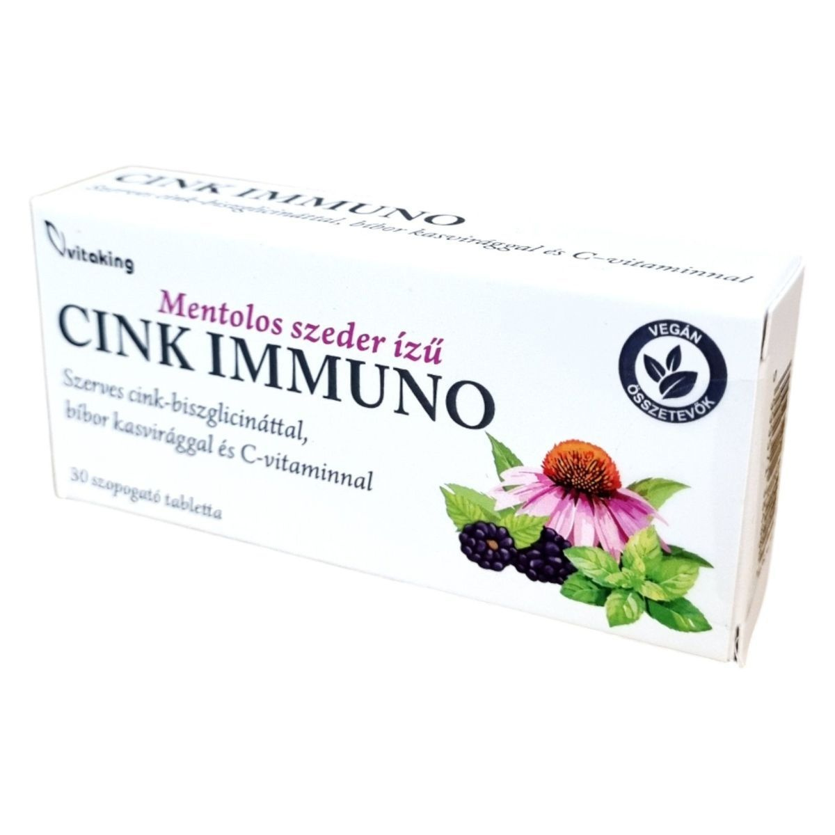 A Vitaking CINK IMMUNO szopogató tabletta mentolos szeder ízű, és szerves cink-biszglicináttal, bíbor kasvirággal és C-vitaminnal készült. A C-vitamin és a cink hozzájárulhat az immunrendszer normál működéséhez, míg az Echinacea purpurea (bíbor kasvirág) támogathatja a szervezet védekező rendszerének megfelelő működését. A termék 30 tablettát tartalmaz, és édesítőszerrel készült. A napi ajánlott mennyiséget ne lépje túl, és terhesség, valamint szoptatás alatt nem ajánlott a fogyasztása.