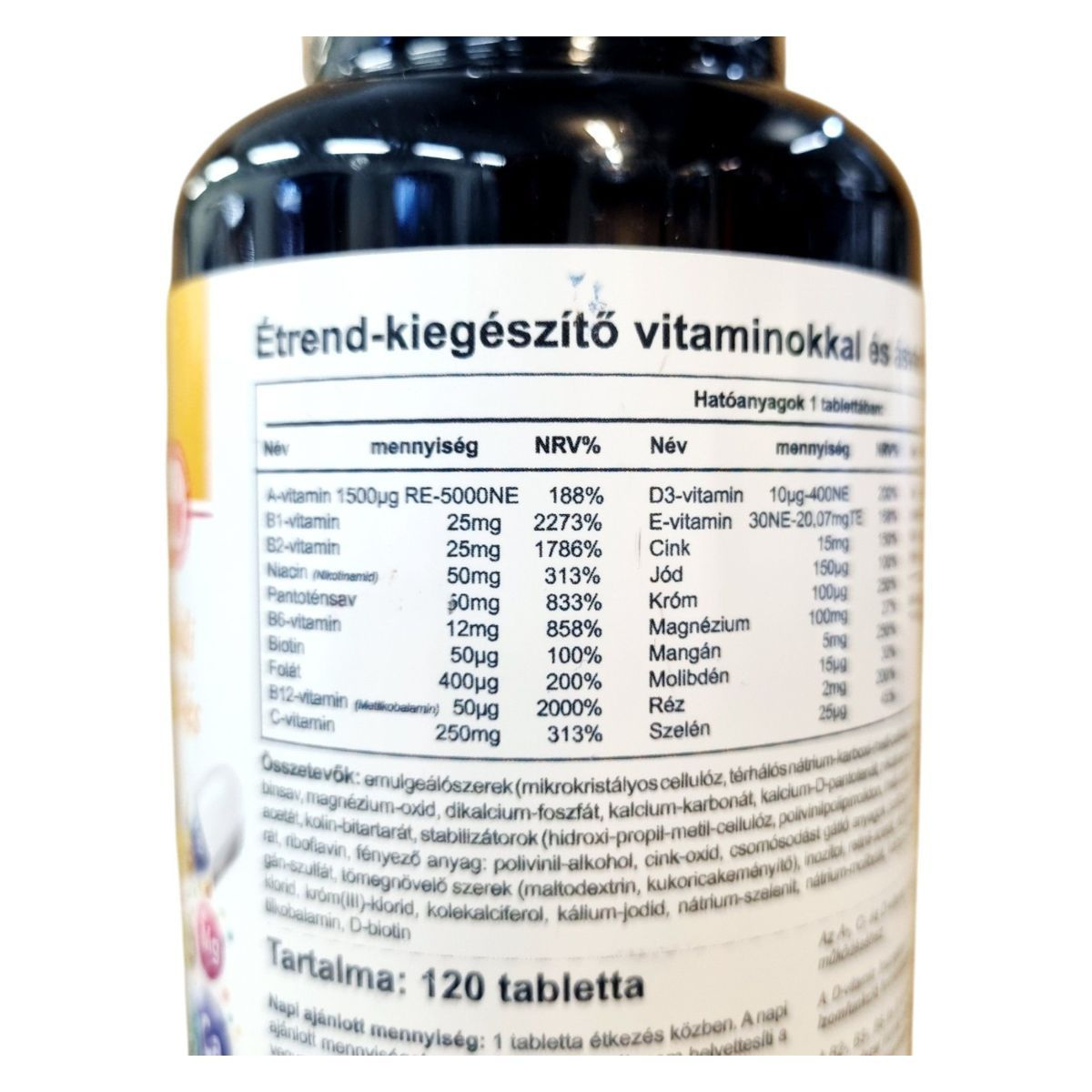 emulgeálószerek (mikrokristályos cellulóz, térhálós nátrium-karboxi-metil-cellulóz), magnézium-oxid, dikalcium-foszfát, kalcium-karbonát, kalcium-D-pantotenát, nikotinamid, para-amino-benzoesav, D-alfa-tokoferil-acetát, kolin-bitartarát, stabilizátorok (hidroxi-propil-metil-cellulóz, polivinil-alkohol, talkum), cink-oxid, csomósodást gátló anyag: polivinil-alkohol.
