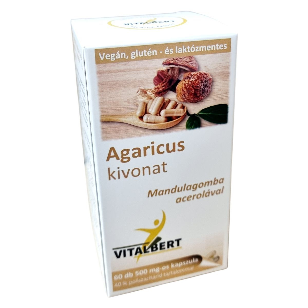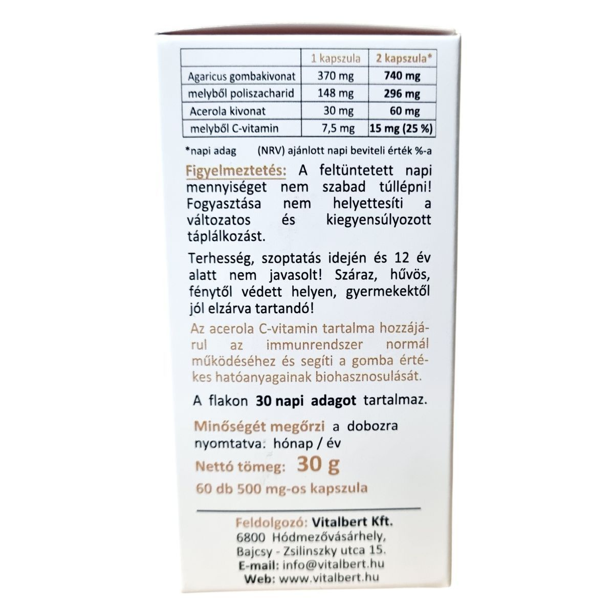 Agaricus blazei kivonat, acerola kivonat, növényi kapszulahéj (hidroxipropil-metilcellulóz)