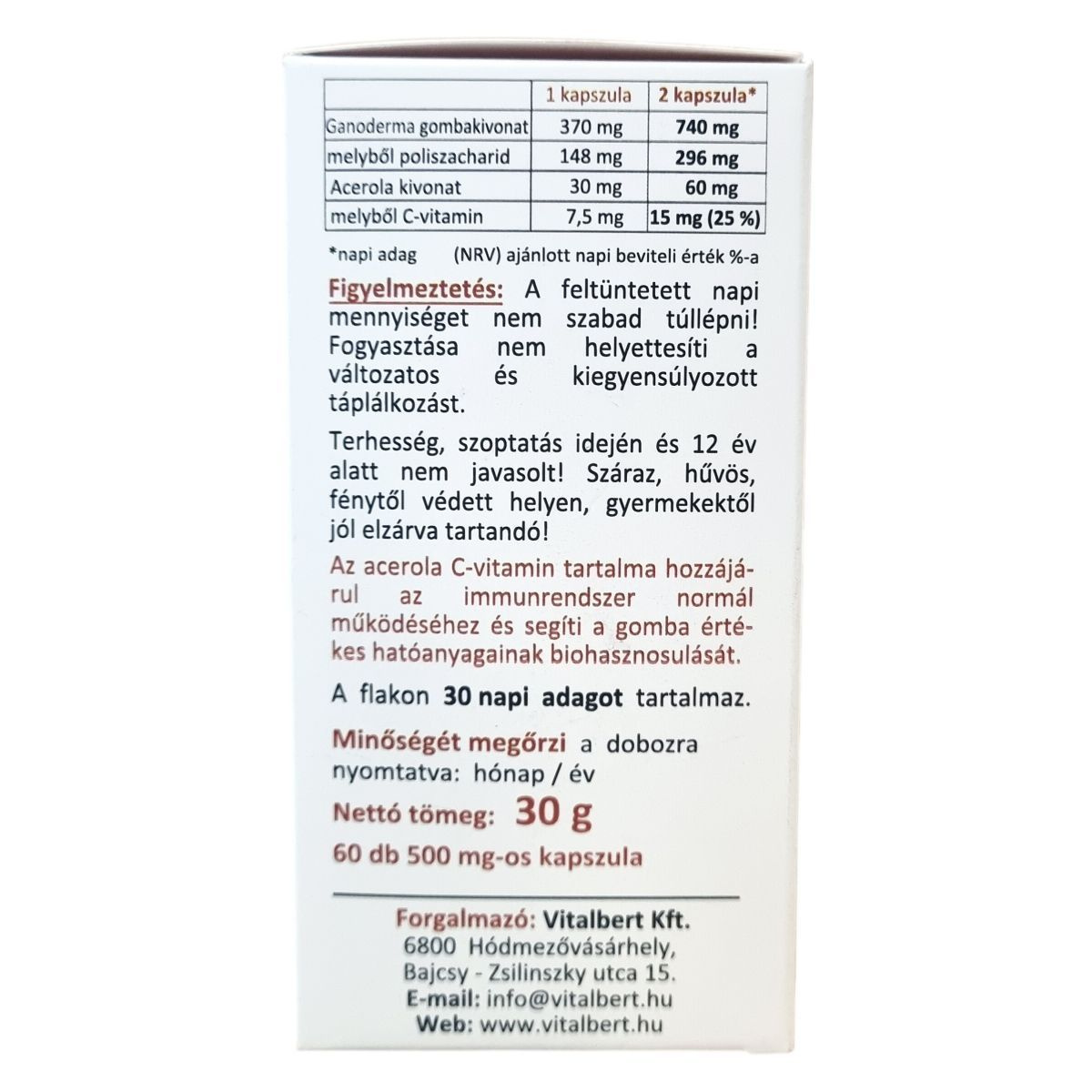 A termék prémium minőségű ganoderma lucidum (Pecsétviasz gomba, Reishi) kivonatból és acerola kivonatból készül. A Ganoderma nemzetséghez tartozó Pecsétviasz gomba leginkább a mérsékelt éghajlati övben honos. A Vitalbert által feldolgozott kivonat a teljes termőtestből készül, hagyományos vizes extrakciós eljárással, amely 40% poliszacharid tartalommal rendelkezik. Az acerola C-vitamin tartalma hozzájárulhat az immunrendszer normál működéséhez és elősegítheti a gomba értékes hatóanyagainak biológiai hasznosulását. A C-vitamin napi 25%-os ajánlott beviteli értéket biztosíthat. A termék nem tartalmaz tartósítószert, színezéket vagy allergén adalékanyagokat, és független laboratóriumban ellenőrzik az alapanyag minőségét és tisztaságát. A flakon 30 napi adagot tartalmaz, a nettó tömege 30 g, 60 db 500 mg-os kapszulával.
