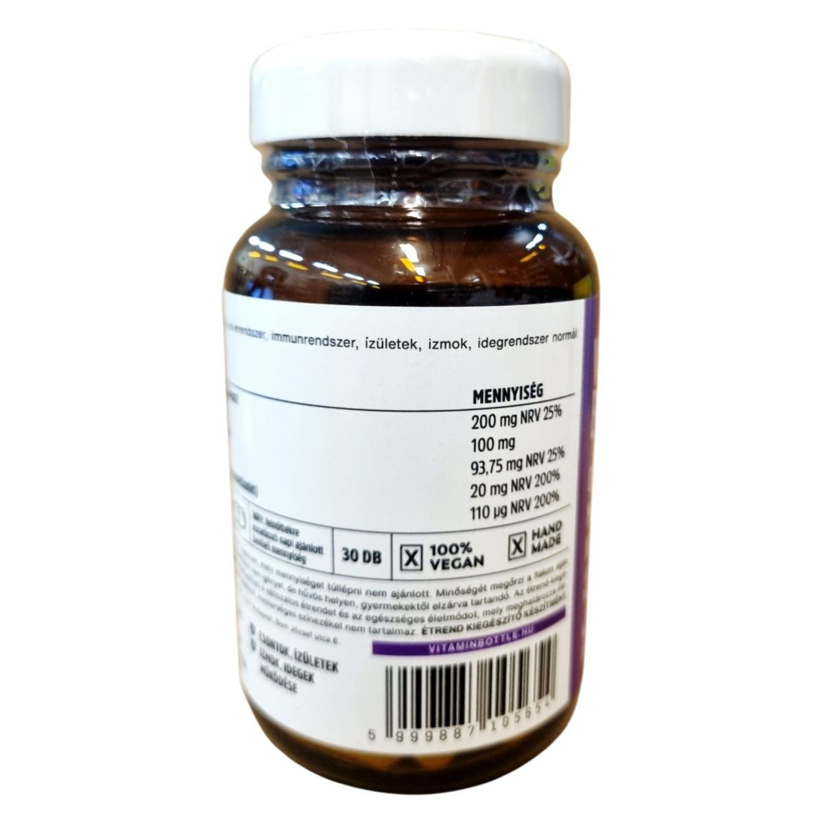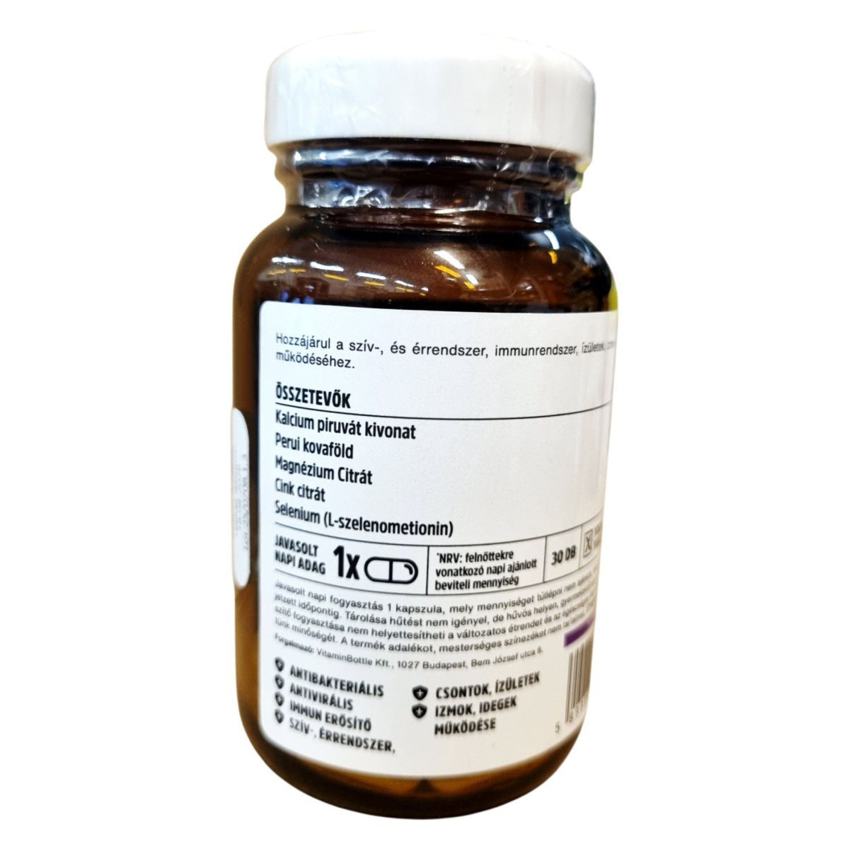 A VitaminBottle Kalcium–Magnézium–Cink–Szelén komplex növényi alapú étrend-kiegészítő, amely válogatott természetes összetevőkkel készül. A kalcium és magnézium hozzájárulhat az izmok, idegek és csontok normál működéséhez, míg a cink és a szelén szerepet játszhat az immunrendszer egészséges működésének fenntartásában. A termék antibakteriális és antivirális tulajdonságokkal bíró elemeket is tartalmazhat, így segítheti a szervezet védekezőképességét. 100%-ban vegán, kézzel készült (hand made) kapszula, amely nem tartalmaz mesterséges adalékanyagokat vagy színezékeket. Kiszerelése 30 darab kapszula, amelyek napi egyszeri adagolás mellett egy hónapra elegendőek lehetnek.