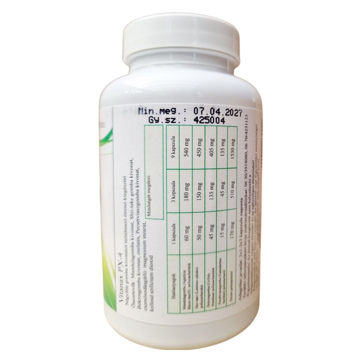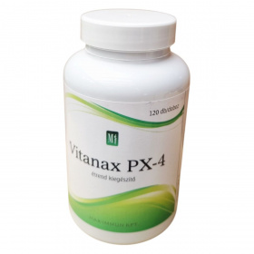 A Vitanax PX-4 egy növényi kivonatokat tartalmazó étrend-kiegészítő, amely mandulagomba, shiitake gomba és bokrosgomba kivonatokat tartalmazhat. Ezek az összetevők hozzájárulhatnak az immunrendszer támogatásához. A termék színezékmentes zselatin kapszulákban kapható, és csomósodásgátlóként magnézium sztearátot és kolloid szilícium dioxidot tartalmaz. A termék fogyasztása előtt érdemes orvosi tanácsot kérni, és az ajánlott napi mennyiséget nem szabad túllépni. A terméket száraz, hűvös helyen, nedvességtől óvva kell tárolni. Forgalmazza a Max-Immum Kft., amelynek székhelye Budapest, Izabella u. 82.