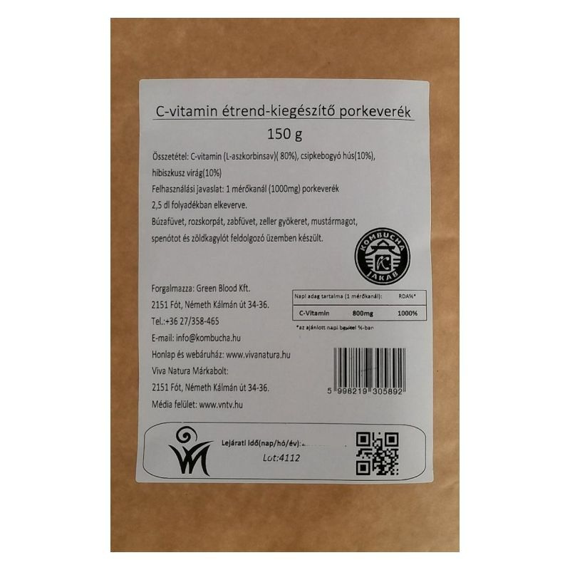 Felhasználási javaslat: 4 púpozott mérőkanál (1000mg) porkeverék 2,5 dl folyadékban elkeverve. Nyomokban búzafüvet, rozskorpát, zabfüvet, zellergyökeret, mustármagot, spenótot és zöldkagylót tartalmazhat. Napi adag tartalma (4 mérőkanál): C-vitamin: 800mg, RDA%: 1000%. RDA%: felnőttek számára ajánlott napi bevitel %-ban. Összetétel: C-vitamin (L-aszkorbinsav)(80%), csipkebogyó hús (10%), hibiszkusz virág (10%).