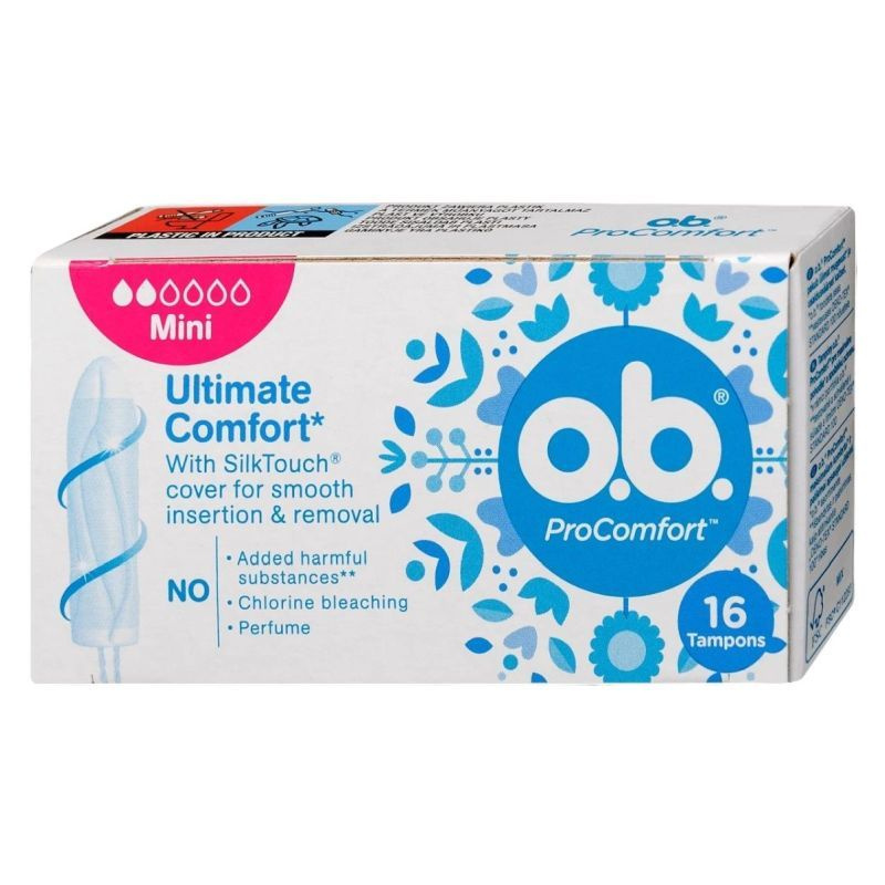 Az o.b.® ProComfort könnyű felhelyezést és eltávolítást biztosít az egyedi SilkTouch borításnak köszönhetően, továbbá megbízható védelmet nyújt a forradalmi DynamicFit technológia 3D irányú tágulásának segítségével, amely által a felhelyezett tampon a testedhez igazodik, és az összefonódó bordázat pedig hatékonyan oszlatja el a folyadékot a tampon belsejében. A tampon nagyon kicsi, és vékony, lekerekített csúcsa van, így a legkönnyebben felhelyezhető o.b.®. Az o.b.® ProComfort Mini (illessze be nedvszívó képességet jelölő, cseppek szerinti besorolást) a legmegfelelőbb a kezdő tamponhasználóknak és azokra a napokra, amikor gyenge-közepes a vérzés erőssége.