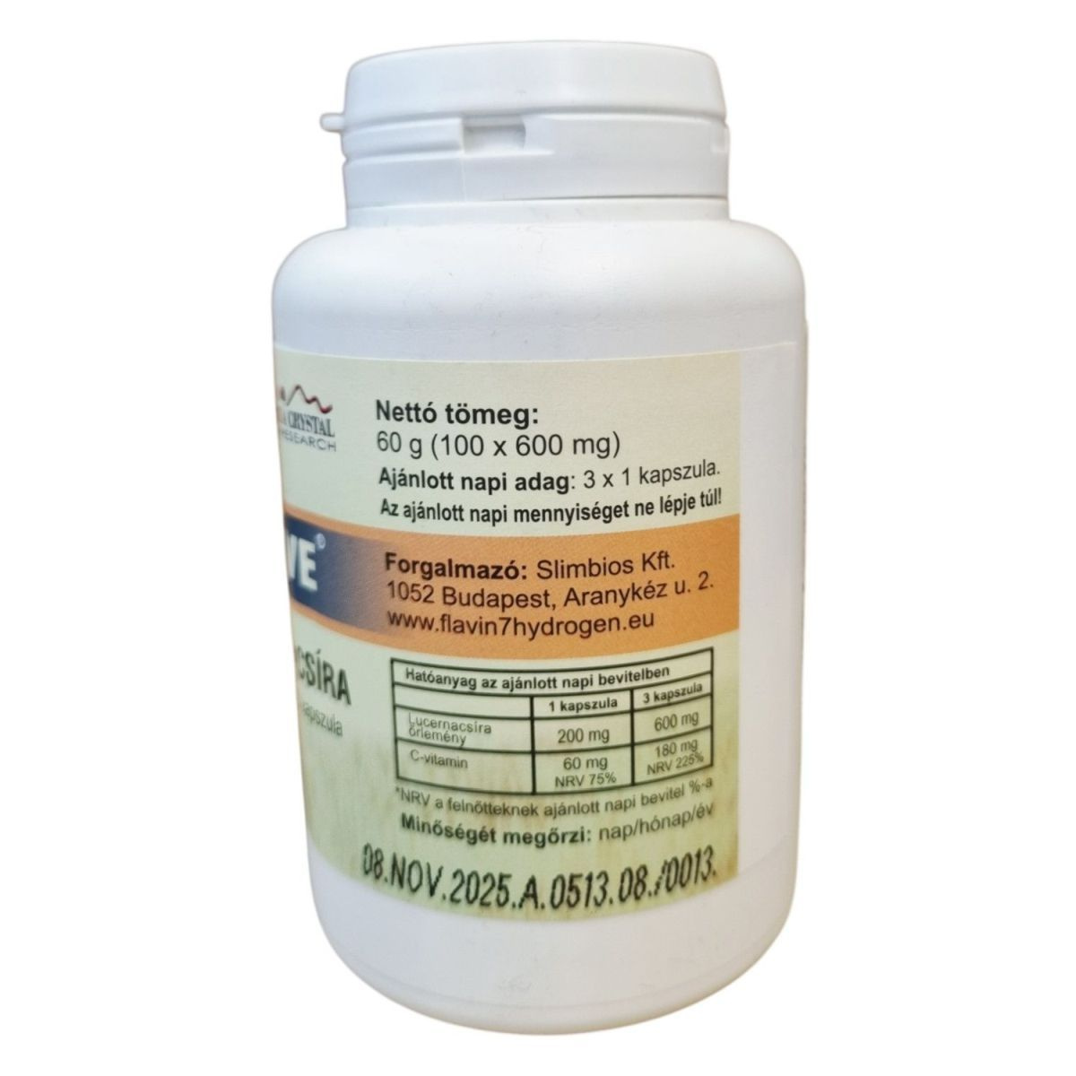 A VITA ACTIVE FLAVIN 7 LUCERNACSÍRA étrend-kiegészítő kapszula lucernacsíra őrleményt és C-vitamint tartalmaz, amely hozzájárulhat az immunrendszer normál működéséhez. A termék napi háromszori fogyasztása javasolt, és fontos, hogy az ajánlott mennyiséget ne lépjük túl. A kapszula összetevői között megtalálható a cirok mag-héj őrlemény és a HPMC kapszula, amely hipromellózt, cink-oxidot, sűrítőanyagot és emulgeálószert tartalmaz. Az étrend-kiegészítő nem helyettesíti a kiegyensúlyozott étrendet és az egészséges életmódot, ezért fontos, hogy kisgyermekektől elzárva, száraz és hűvös helyen tároljuk. A terméket a Slimbios Kft. forgalmazza.