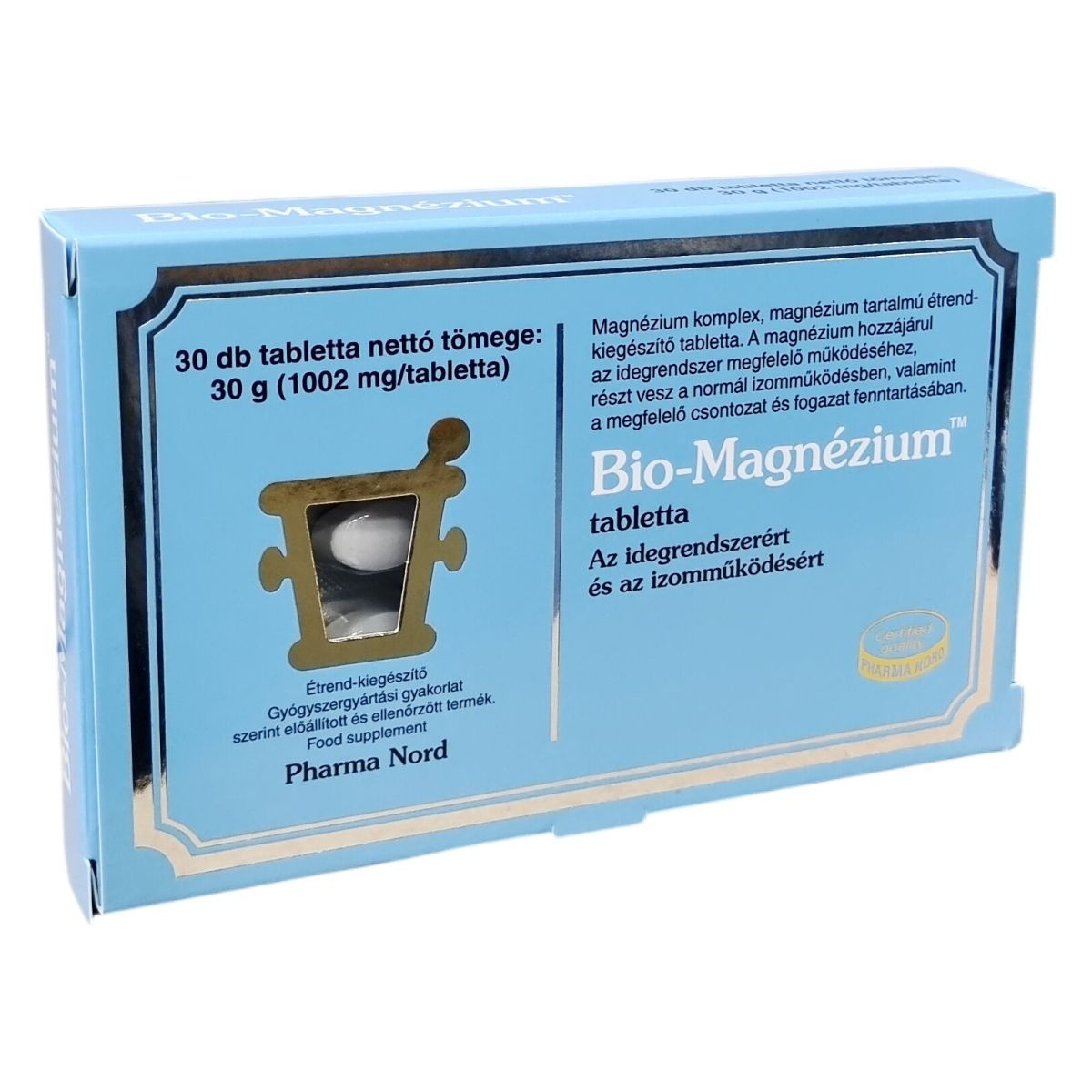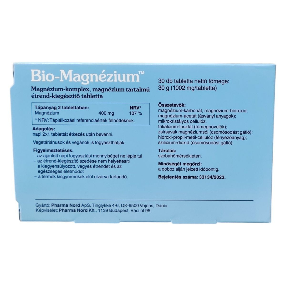 A Bio-Magnézium™ tabletta magnézium-komplexet tartalmaz, mely támogatja az idegrendszer, a normál izomműködés, valamint a csontozat és a fogazat megfelelő fenntartását. A termék gyógyszergyártási gyakorlat szerint készül és ellenőrzött minőségű. A készítmény összetevői között ásványi anyagok és tömegnövelők találhatók, mint például a magnézium-karbonát, magnézium-hidroxid, magnézium-acetát, mikrokristályos cellulóz és trikalcium-foszfát, továbbá csomósodást gátló és fényezőanyagok is. A tabletta nettó tömege 30 g, egy tabletta súlya 1002 mg. A termék mind vegetáriánusok, mind vegánok számára alkalmas lehet.