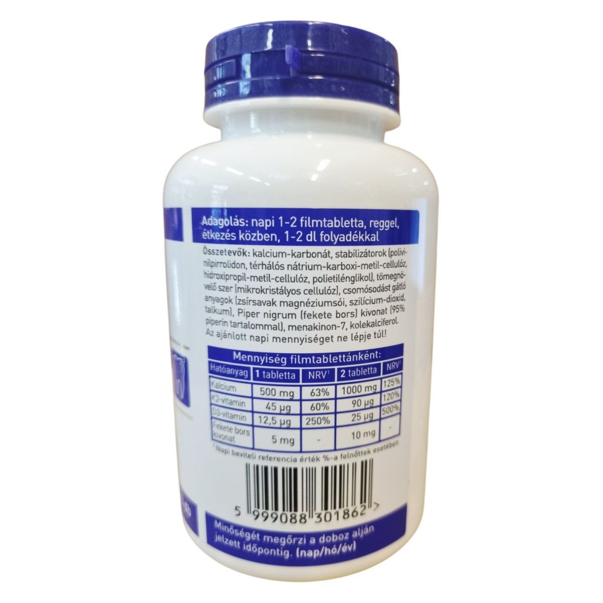 Kalcium-karbonát, stabilizátorok (polivinilpirrolidon, térhálós nátrium-karboxi-metil-cellulóz, hidroxi-propil-metil-cellulóz, polietilénglikol), tömegnövelő szer (mikrokristályos cellulóz), csomósodást gátló anyagok (zsírsavak magnéziumsói, szilícium-dioxid, talkum), Piper nigrum (fekete bors) kivonat (95% piperin tartalommal), menakinon-7, kolekalciferol.
