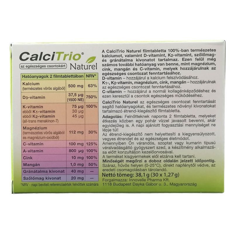 A CalciTrio Naturel filmtabletta 100%-ban természetes kalciummal támogatja a csontok egészségét. A készítmény 10 féle összetevőt tartalmaz: számos vitamint, ásványi anyagot és nyomelemet, melyek segítik az egészséges csontozat fenntartását, ezen felül még gránátalma és szőlőmag kivonatot.