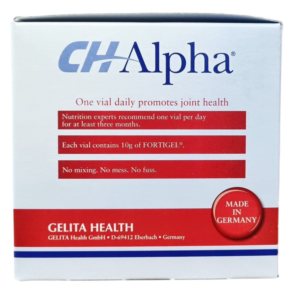 A CHAlpha® termék a FORTIGEL® hidrolizált kollagénpeptidet tartalmazza, amely a porcszövet egyik fő alkotóeleme. A készítmény kiváló felszívódású folyékony ampullákban kerül forgalomba, kellemes gyümölcsös ízesítéssel. A termék általánosan javasolt adagja egy ampulla naponta, a legjobb hatás eléréséhez legalább három hónapig folyamatosan javasolt a használata. Az ampullák használata egyszerű, előre adagolt mennyiséget biztosít, így nincs szükség keverésre vagy méricskélésre. A készítmény nem tartalmaz glutént és laktózt, allergének közül árpát tartalmaz. A termék pH-értéke 3,9–4,2 között mozog, sűrűsége pedig 1,145–1,165 g/ml.
