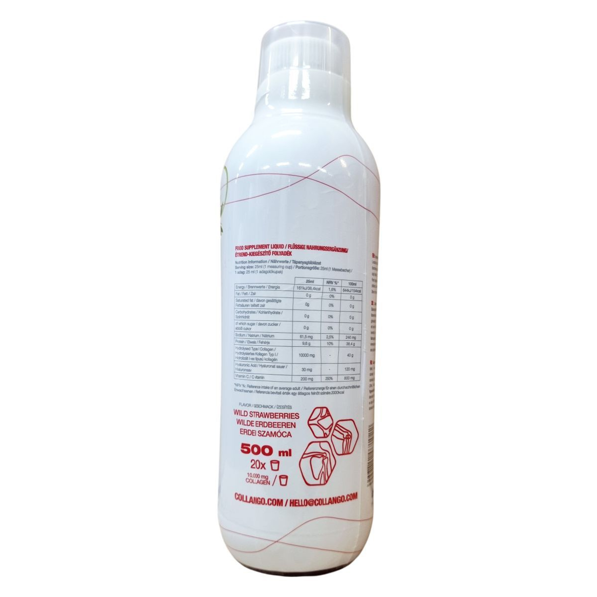 A Collango Collagen Liquid folyékony étrend-kiegészítő vadon termő erdei szamóca ízesítéssel készül. Egy adag 25 ml hidrolizált I-es típusú marha kollagént, hialuronsavat és nagy dózisú C-vitamint tartalmaz. A termék allergénmentes, napi fogyasztása vízben elkeverve javasolt. Kiszerelés: 500 ml, amely 20 adagnak felel meg. Ízesítés: Wild Strawberries / Erdei szamóca. Kapcsolat: collango.com, hello@collango.com.
