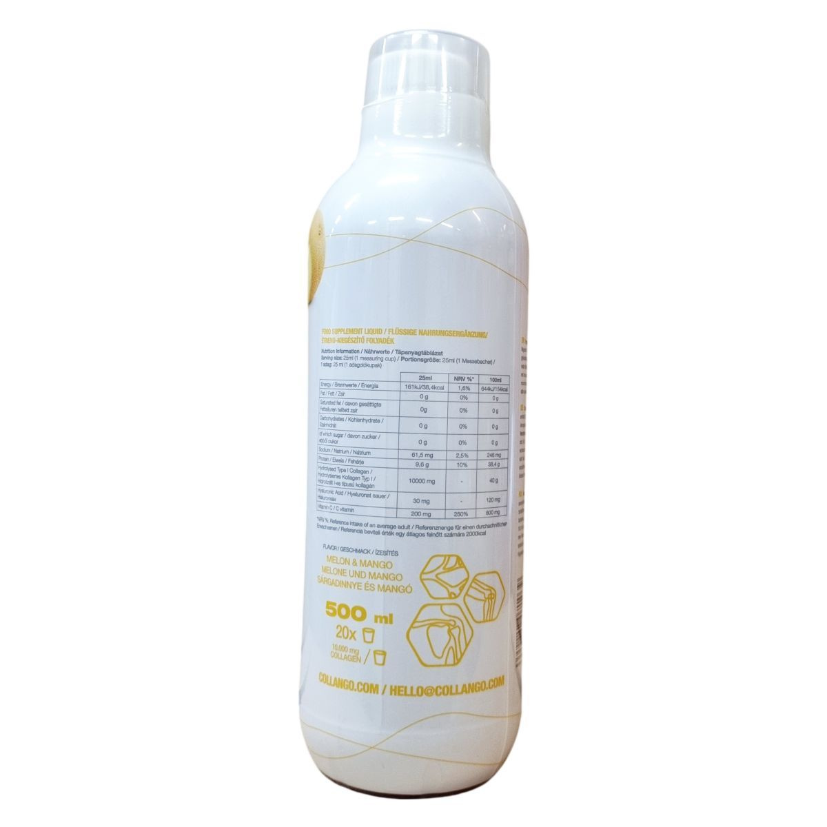 A COLLANGO COLLAGEN LIQUID egy folyékony étrend-kiegészítő, amely tisztított vizet, 1-es típusú hidrolizált marha kollagént, L-aszkorbinsavat, citromsavat, aromát, nátrium-sóját a hialuronsavnak, kurkuminnal színezett, valamint szukralózt és szteviol-glikozidokat tartalmaz édesítőként. A termék sárgadinnye és mangó ízesítésű. Az adagolás során javasolt a folyékony koncentrátumot 150 ml vízzel összekeverve fogyasztani. A készítmény allergénmentes és nem helyettesíti a változatos étrendet és egészséges életmódot. Gyermekektől elzárva kell tárolni, és az ajánlott napi adagolást nem szabad túllépni. A csomagot szobahőmérsékleten célszerű tartani, felbontás után azonban hűtőszekrényben, és 30 napon belül fogyasztandó el.