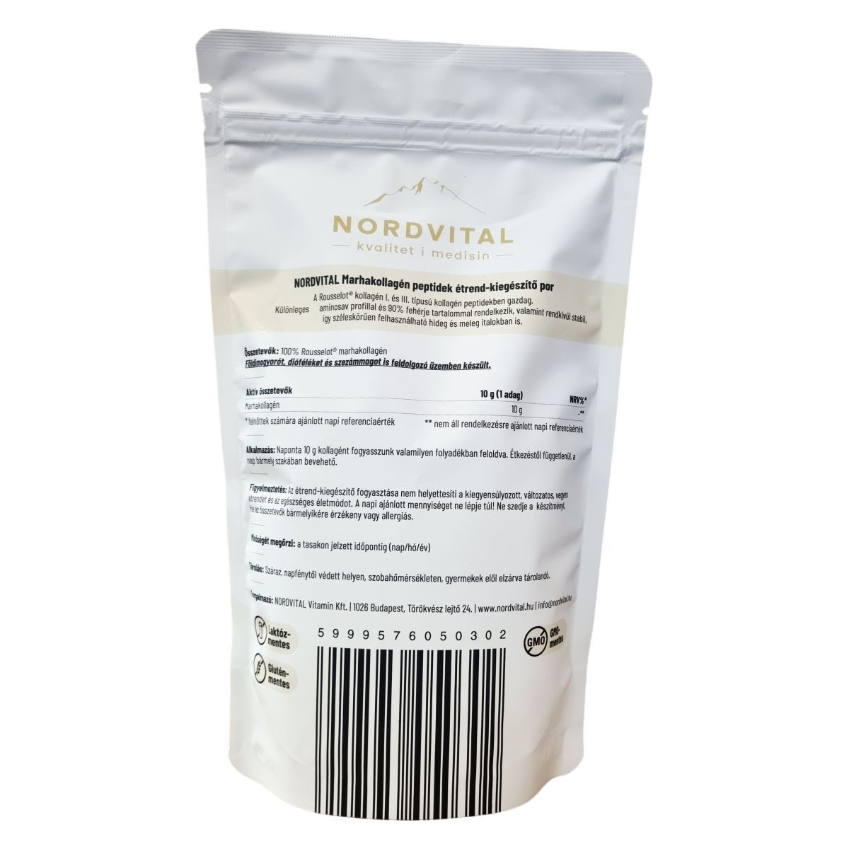 A NORDVITAL Marhakollagén peptidek a Rousselot® márkájú I. és II. típusú kollagén peptidekre épülnek, melyek különleges aminosav profillal és magas, 90%-os fehérjetartalommal rendelkeznek. A termék rendkívül stabil, így sokféle hideg és meleg italban is felhasználható. A csomagolás 30 adagot tartalmaz, összesen 300 gramm por formájában. A készítmény laktóz- és gluténmentes, azonban elkészítése során dióféléket és szezámmagot is feldolgozó üzem áll rendelkezésre, ezért allergiás személyeknek fokozott figyelemmel kell használniuk. A termék fogyasztása önmagában nem helyettesíti a változatos és kiegyensúlyozott étrendet, valamint az egészséges életmódot.