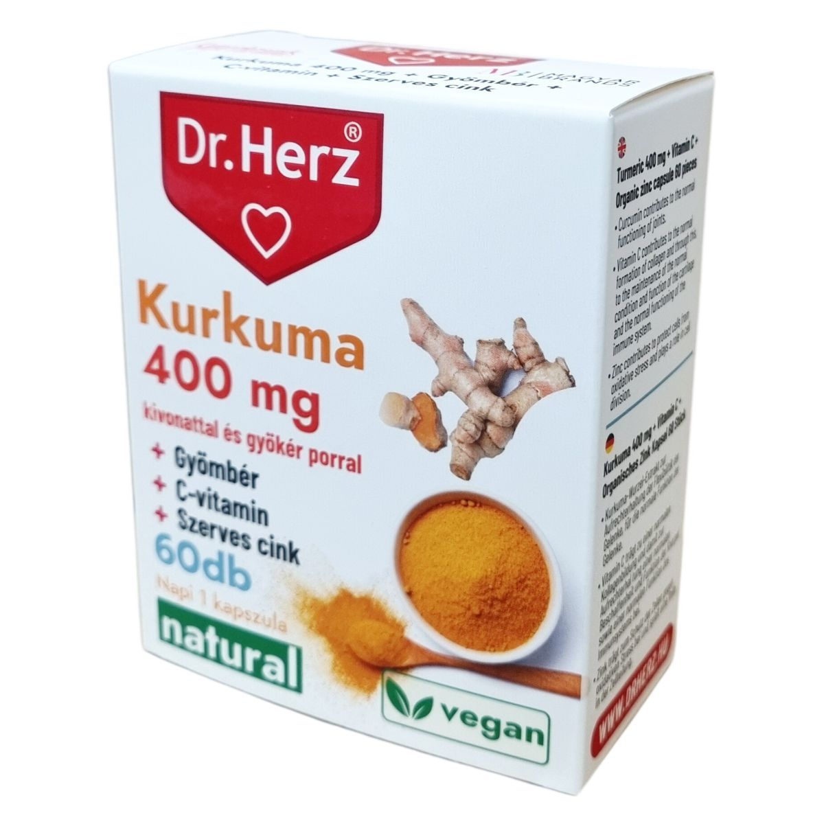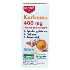 A Dr.Herz® Kurkuma 400 mg kapszula kurkuma gyökér port és kivonatot, gyömbér gyökér port, C-vitamint és jól hasznosuló szerves cinket tartalmaz. A C-vitamin hozzájárulhat a normál kollagénképződéshez, ezáltal támogathatja a porcok normál állapotának és működésének fenntartását, valamint az immunrendszer egészséges működését. A cink szerepet játszhat a normál csontozat fenntartásában, a sejtek oxidatív stresszel szembeni védelmében, valamint a zsírsavak normál anyagcseréjében. A termék természetes összetevőkkel készül, vegánok számára is megfelelő, és napi egyszeri adagként ajánlott. Nem ajánlott epeköveseknek vagy azoknak, akik epekőképződésre hajlamosak, továbbá véralvadásgátló szedése esetén orvosi tanács kérendő a fogyasztás előtt.