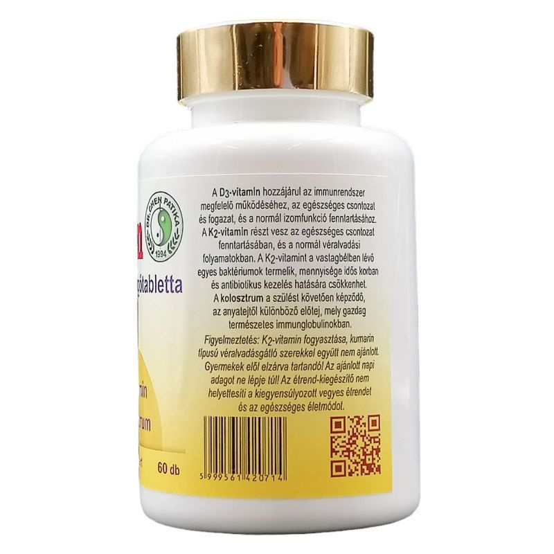 Összetevők: kolosztrum, kukoricakeményítő, glukóz, szorbit (édesítőszer), magnézium-sztearát (stabilizátor), kalcium-karbonát (csomósodást gátló), K2-vitamin (menakinon), D3-vitamin (kolekalciferol). Hatóanyagok a napi adagolásra napi 2 tablettában: D3-vitamin: 100 µg (NRV 2000%), K2-vitamin: 120 µg (NRV: 160%), kolosztrum: 1000 mg, immunglobulin (IgG): 80 mg. Adagolás (felhasználás): naponta 2x1 tabletta elrágva.