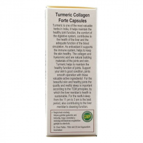 A kurkuma az indiai gasztronómia egyik leghíresebb gyöngyszeme, kedvező élettani hatása miatt népszerűsége egyre nagyobb. A kurkuma segít fenntartani az ízületek mozgathatóságát, egészséges működését. Antioxidánsként támogatja az immunrendszert, valamint a bőr egészségét. A kollagén az ízületekben és a bőrben természetesen is megtalálható rugalmas fehérje, a hyaluronsavval hozzájárulnak a bőr rugalmasságának megőrzéséhez. Támogassa bőrének jó állapotát, ízületeinek könnyű mozgathatóságát ezekkel az értékes hatóanyagokkal! Naponta: 2 × 1 kapszula szedése javasolt 3 deci vízzel bevéve.