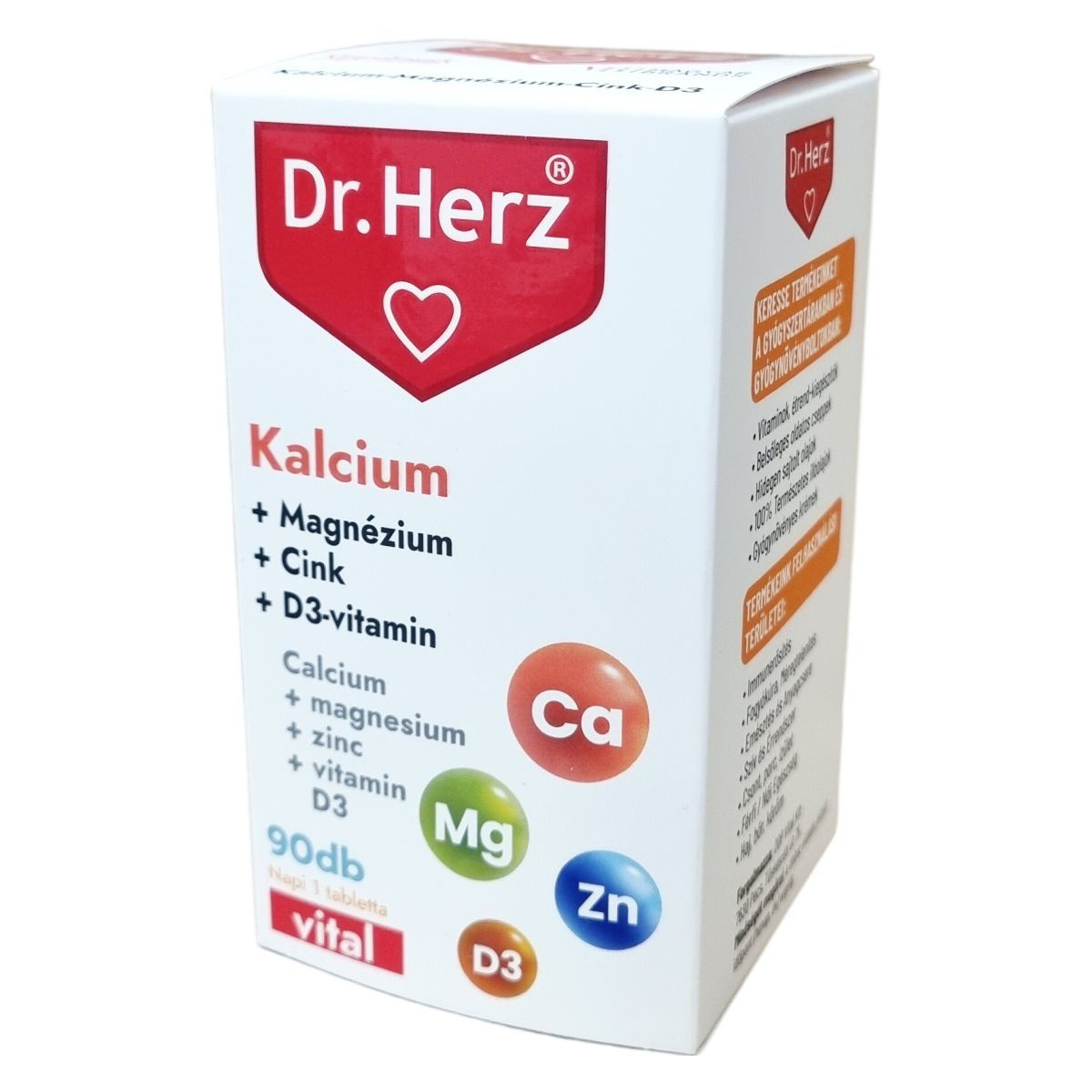 A Dr.Herz® Kalcium + Magnézium + Cink + D3-vitamin tabletta egy komplex étrend-kiegészítő, mely a kalcium és magnézium révén hozzájárulhat a normál fogazat, csontozat fenntartásához és az izomműködés támogatásához. A magnézium emellett hozzájárulhat az idegrendszer megfelelő működéséhez. A cink szerepet játszhat a csontozat, haj, bőr és köröm normál állapotának fenntartásában, valamint az immunrendszer megfelelő működésének támogatásában. A D-vitamin elősegítheti a kalcium és foszfor optimális felszívódását, hasznosulását, mely támogatja az egészséges csontozatot, izomfunkciót és a normál fogazat fenntartását. A termék összetevői között megtalálhatóak különböző segédanyagok és stabilizátorok, amelyek biztosítják a tabletta minőségét és állagát. A készítményt naponta egy tabletta formájában, főétkezés előtt, bőséges folyadékkal javasolt bevenni. Az étrend-kiegészítő nem helyettesíti a vegyes táplálkozást és egészséges életmódot, és gyermekek elől elzárva ajánlott tárolni.