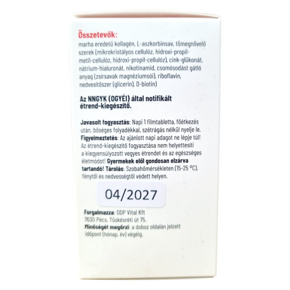 Marha eredetű kollagén, L-aszkorbinsav, tömegnövelő szerek (mikrokristályos cellulóz, hidroxipropil-metil-cellulóz, hidroxipropil-cellulóz), cink-glükonát, nátrium-hialuronát, nikotinamid, csomósodást gátló anyag (zsírsavak magnéziumsói), riboflavin, nedvesítőszer (glicerin), D-biotin