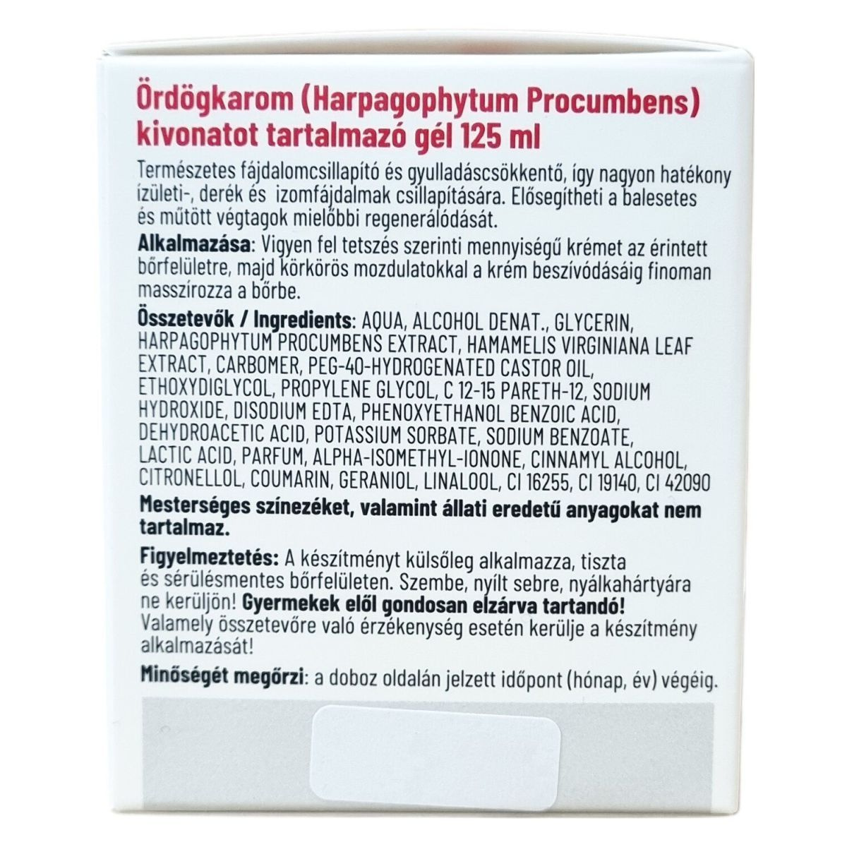 Az Ördögkarom (Harpagophytum Procumbens) kivonatot tartalmazó gél természetes eredetű, mesterséges színezéket és állati eredetű anyagokat nem tartalmaz. Természetes fájdalomcsillapító és gyulladáscsökkentő tulajdonságokkal rendelkezik, így különösen hatékony ízületi, derék- és izomfájdalmak enyhítésére. Segítheti a sérült vagy műtött végtagok gyorsabb regenerálódását. A krém hatása gyulladáscsökkentő, nyugtató és bőrnyugtató, optimálisan támogatja a fájdalmas ízületek ápolását. A termék ajánlott továbbá immunerősítésre, méregtelenítésre, anyagcsere támogatására, valamint a bőr, haj és köröm ápolására. Kizárólag gyógyszertárakban és gyógynövényboltokban kapható, német minőségben készül, és folyamatosan biztosítja az optimális bőrápolást és fájdalomcsillapítást.