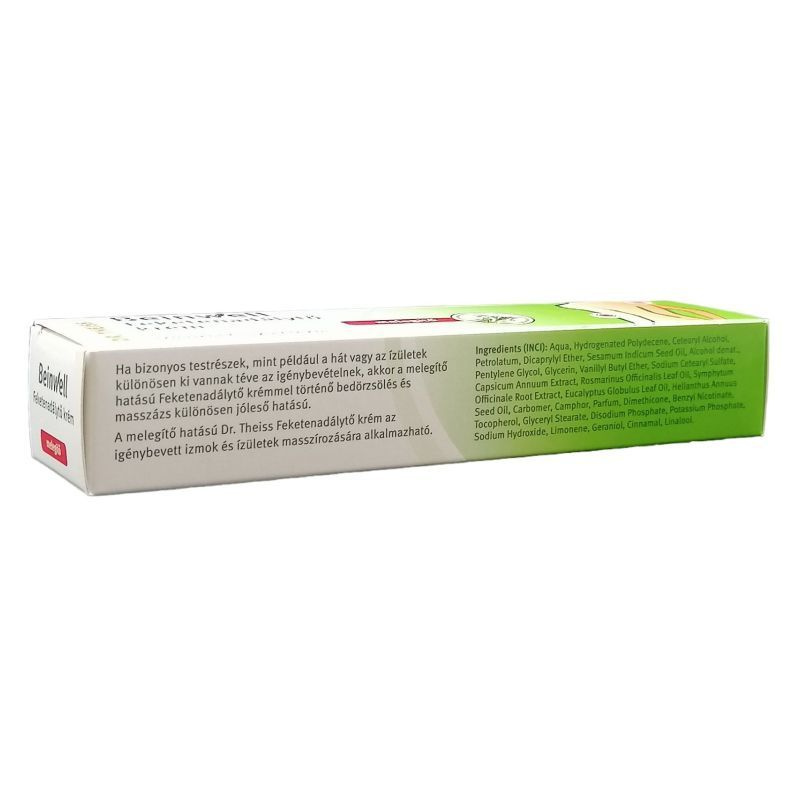 Ingredients: Aqua, Hydrogenated Polydecene, Cetearyl Alcohol, Petrolatum, Dicaprylyl Ether, Sesamum Indicum Seed Oil, Alcohol denat., Pentylene Glycol, Glycerin, Vanillyl Butyl Ether, Sodium Cetearyl Sulfate, Capsicum Annuum Extract, Rosmarinus Officinalis Leaf Oil, Symphytum Officinale Root Extract, Eucalyptus Globulus Leaf Oil, Helianthus Annuus Seed Oil, Carbomer, Camphor, Parfum, Dimethicone, Benzyl Nicotinate, Tocopherol, Glyceryl Stearate, Disodium Phosphate, Potassium Phosphate, Sodium Hydroxide, Limonene, Geraniol, Cinnamal, Linalool.