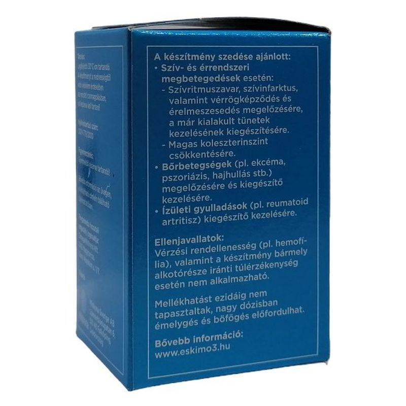 Bőrbetegségek (pl.ekcéma, pszoriázis, hajhullás stb.) enyhébb formáinak megelőzésére és kiegészítő kezelésére. Ízületi gyulladások kiegészítő kezelésére. Az Eskimo-3 az egyetlen halolaj készítmény a piacon, amelyik több mint 6 hónapig nem avasodik meg! Kiszerelés: 105db.