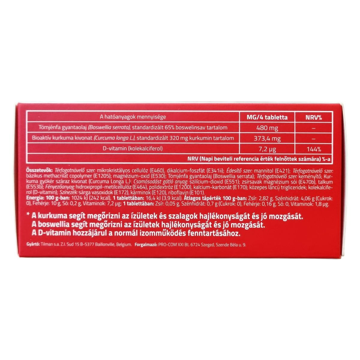 mikrokristályos cellulóz (E460), dikalcium-foszfát (E341ii), mannitol (E421), bázikus methacrilát copolymer (E1205), magnézium-oxid (E530), tömjénfa gyantaolaj (Boswellia serrata), keményítő, kurkuma gyökér száraz kivonat (Curcuma longa L.), szilícium-dioxid (E551), zsírsavak magnézium sói (E470b), talkum (E553b), hidroxipropil-metilcellulóz (E464), polidextróz (E1200), kalcium-karbonát (E170), közepes láncú trigliceridek, kolekalciferol (D-vitamin), sárga vasoxidok (E172), kárminok (E120), riboflavin (E101)
