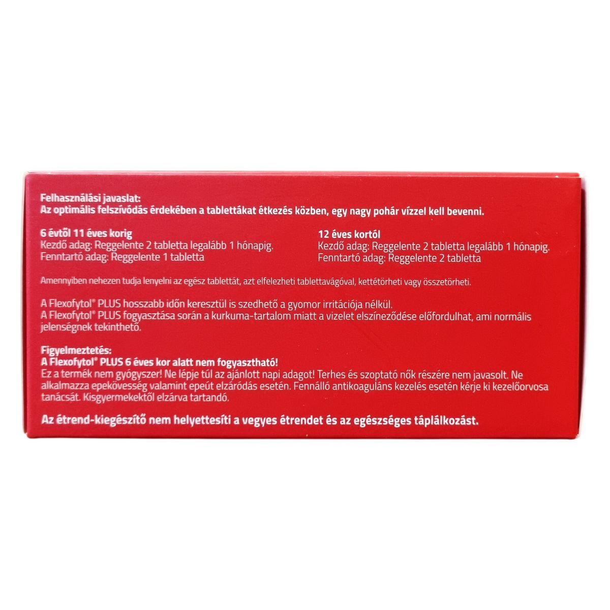 A Flexofytol® PLUS 6 éves kor alatt nem fogyasztható! Ez a termék nem gyógyszer! Ne lépje túl az ajánlott napi adagot! Terhes és szoptató nők részére nem javasolt. Ne alkalmazza epekövesség, valamint epeút elzáródás esetén. Fennálló antikoaguláns kezelés esetén kérje ki kezelőorvosa tanácsát. Kisgyermekektől elzárva tartandó. Az étrend-kiegészítő nem helyettesíti a vegyes étrendet és az egészséges táplálkozást.