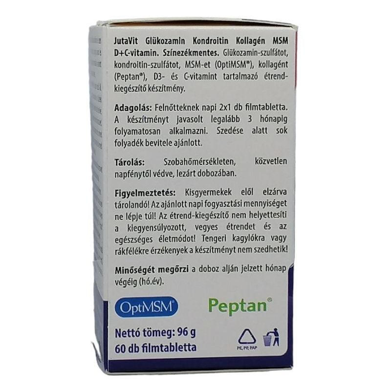 A C-vitamin hozzájárul a kollagén képződéséhez, amely az erek, a bőr, a fogak, a porcok és a csontok normál állapotának fenntartásához szükséges, valamint segíthet a fáradtság és kifáradás csökkentésében. A glükozamin és a kondroitin a porcszövet természetes alkotóelemei, míg a kollagén (Peptan®) marhából származó, nagy tisztaságú kollagén peptid. A D3-vitamin elősegíti a kalcium és foszfor felszívódását, hozzájárul a csontozat és izomfunkciók fenntartásához. Nettó tömeg: 96 g.