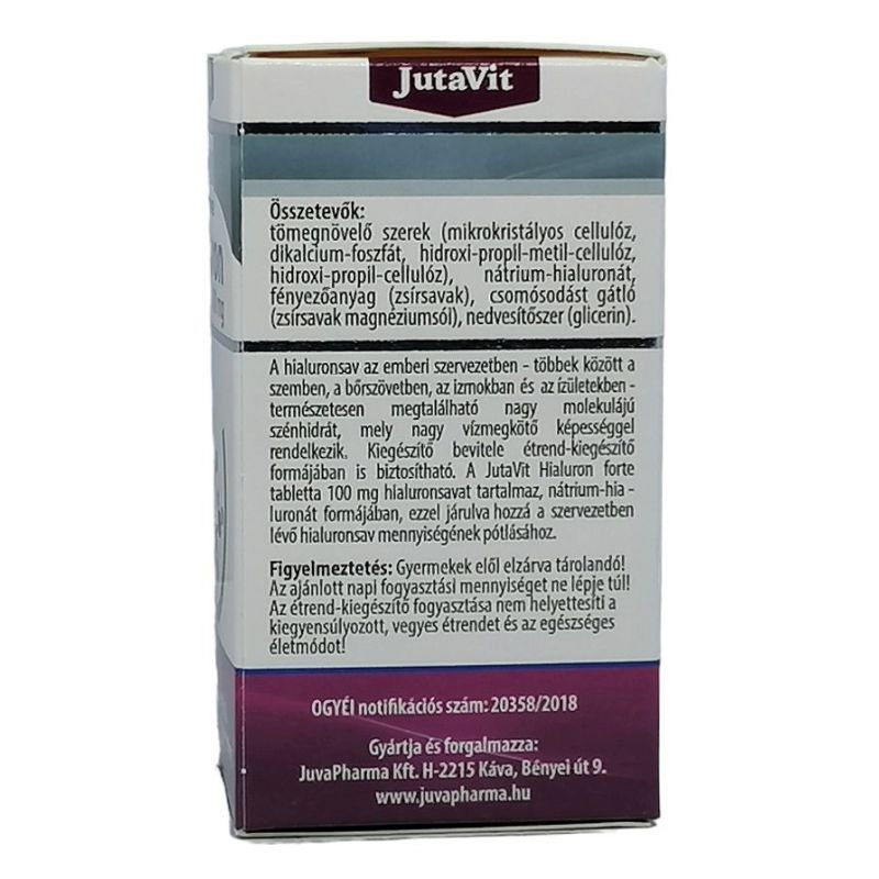 A hialuronsav az emberi szervezetben - többek között a szemben, a bőrszövetben, az izmokban, az ízületekben - természetesen megtalálható nagy molekulájú szénhidrát, mely nagy vízmegkötő képességgel rendelkezik. Kiegészítő bevitele étrend-kiegészítő formájában is biztosítható. A JutaVit hialuron forte tabletta 100mg hialuronsavat tartalmaz, nátrium-hialuronát formájában, ezzel járulva hozzá a szervezetben lévő hialuronsav mennyiségének pótlásához.
