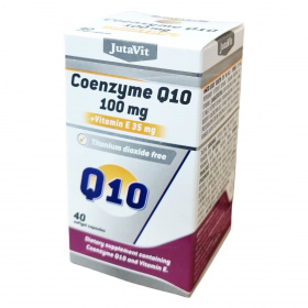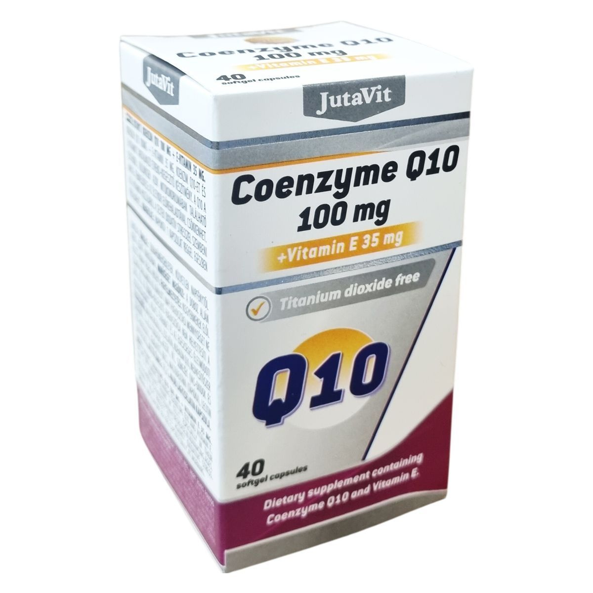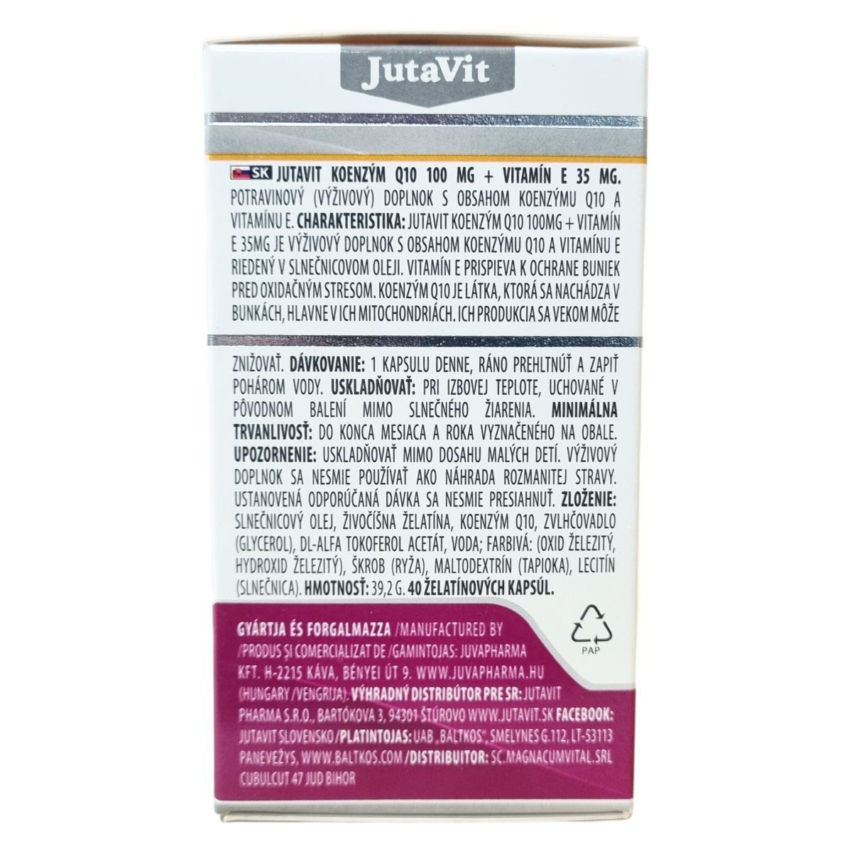 A JutaVit Koenzim Q10 100 mg + E-vitamin 35 mg lágyzselatin kapszulák koenzim Q10-et, valamint E-vitamint tartalmazó étrend-kiegészítők, melyek a sejtek mitokondriumában található anyagot pótolják. A koenzim Q10 termelődése az életkor előrehaladtával csökkenhet, míg az E-vitamin hozzájárulhat a sejtek oxidatív stresz elleni védelméhez. A készítmény napraforgóolajban diszpergált, állati eredetű zselatin kapszula formájában kerül forgalomba. A terméknek nincs meghatározott napi beviteli referencia értéke felnőttek számára. A kapszulák javasolt adagolása napi egy, amelyet reggel, egészben kell lenyelni, vízzel leöblítve. Fontos a termék gyermekektől való távol tartása, valamint, hogy az étrend-kiegészítő nem helyettesíti a változatos étrendet és az egészséges életmódot. A terméket szobahőmérsékleten, fénytől védve, az eredeti csomagolásban kell tárolni.
