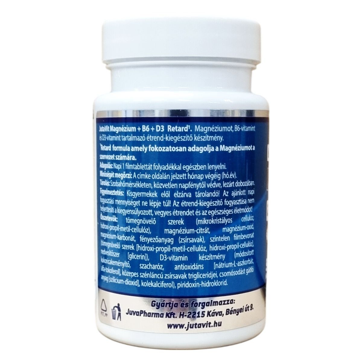 A JutaVit Magnézium + B6 + D3 Retard egy étrend-kiegészítő, amely magnéziumot, B6-vitamint és D3-vitamint tartalmaz. A retard formula fokozatosan adagolja a magnéziumot a szervezetnek, ezáltal biztosíthatja a hosszabb ideig tartó hatást. A magnézium és a B6-vitamin hozzájárulhat az idegrendszer megfelelő működéséhez, a normál pszichológiai funkciók fenntartásához, valamint a fáradtság és kifáradás csökkentéséhez. A magnézium részt vehet a normál csontozat és fogazat fenntartásában. A B6-vitamin támogathatja a normál vörösvérsejt képződést és a hormonális aktivitás szabályozását. A D-vitamin hozzájárulhat az egészséges izomfunkció fenntartásához.