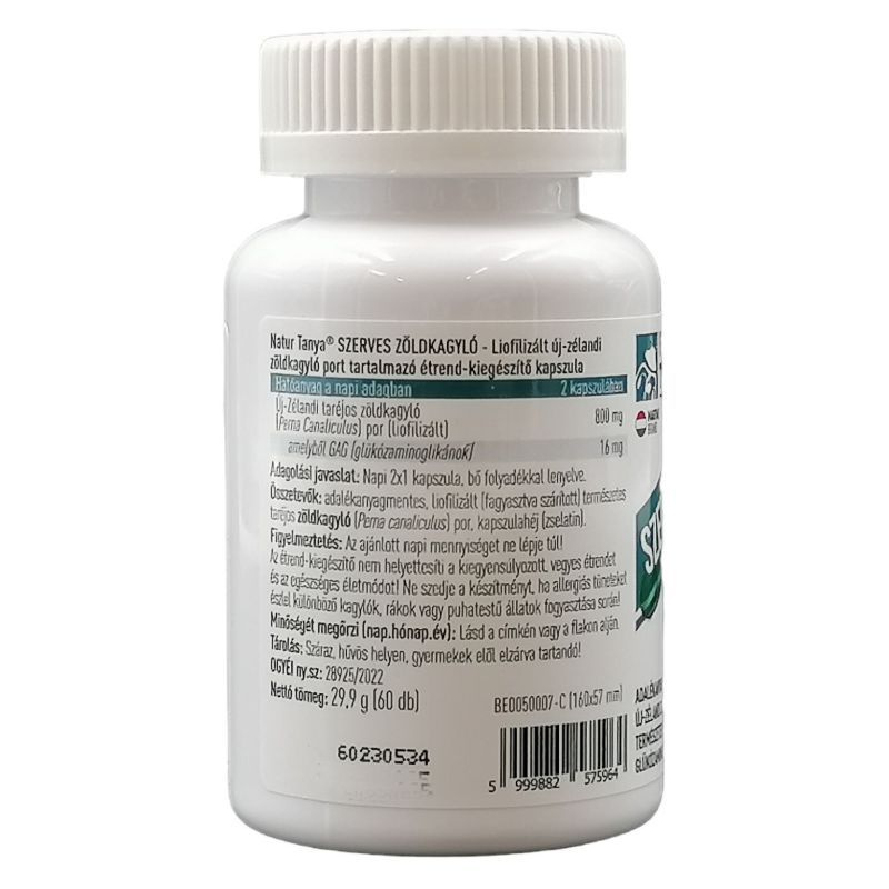 Összetevők: zöldkagyló kivonat, zselatin kapszulahéj. Adagolási javaslat: 2x1 kapszula naponta.