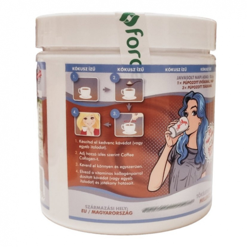 Adagolás: napi 1 púpozott evőkanál (10,5 g) vagy 3 púpozott teáskanál. llleszd be kávézási szokásaidba: a napi adagot megihatod 1 kávéban vagy ha többször kávézol, szét is oszthatod a nap folyamán. 1. készítsd el a kedvenc kávédat vagy egyéb italodat, 2. adj hozzá ízlés szerint Coffee Collagént. 3. keverd el könnyen és egyszerűen. 4. élvezd a vitaminos kollagénporral dúsított kávédat (vagy egyéb italodat, turmix, kakaó) és jótékony hatásait. A bevitt kollagén maximális mértékű hasznosulásához vigyél be rendszeresen C- vitamint a szervezetedbe akár táplálék, akár vitamin formájában.