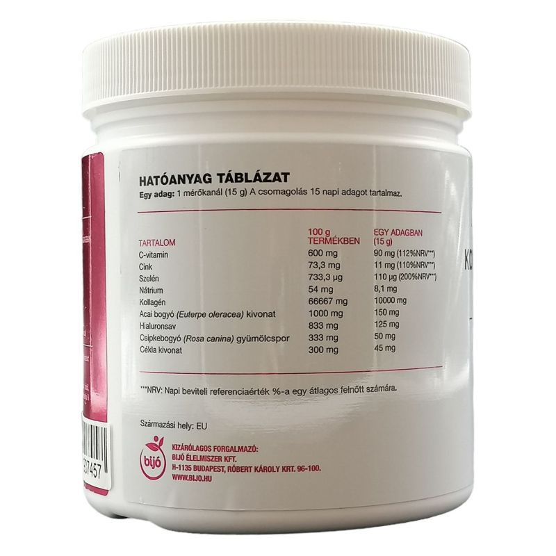 Kollagén (marhából), Maltodextrin, Étkezési sav (citromsav), Csomósodást gátló anyagok (Szilícium-dioxid, Kalcium-foszfátok), Acai bogyó (Euterpe oleracea) kivonat, Hialuronsav, Aroma, Édesítőszerek (Aceszulfám-K, Szukralóz), L-aszkorbinsav, Csipkebogyó (Rosa canina) por, Cékla kivonat, Cink-citrát, Étkezési só, Színezék (Ponszó 4R*), Nátrium-szelenit.