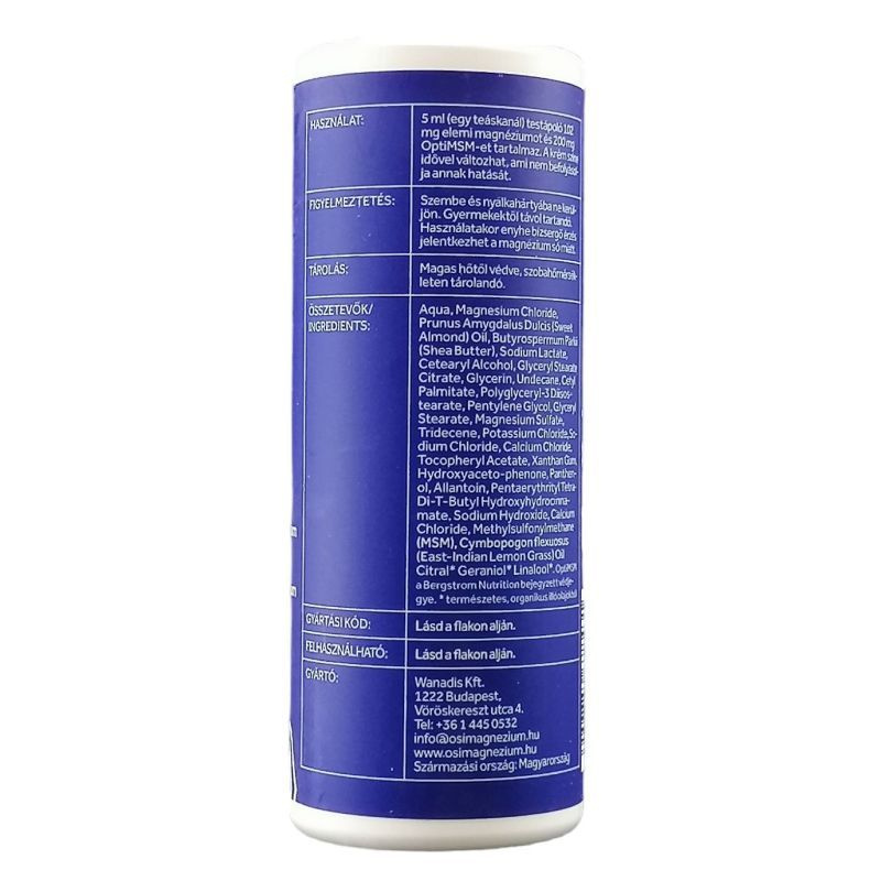 Nagy dózisú elemi magnéziumot juttat a szervezetbe. 25% Ősi Magnézium Koncentrátummal, OptiMSM-el, shea vajjal és édes mandulaolajjal készül, így táplálja és hidratálttá varázsolja a bőrt, illetve támogatja az ízületeket és a csontozatot is. Érzékenyebb bőrűeknek is ajánlott. Könnyed, lágy formulája jól kenhető, gyorsan beszívódik és nem hagy maga után zsíros érzést. Kellemes citrusos illatát a kelet indiai citromfű (BIO) illóolajnak köszönheti, nem hivalkodó, így reggel és este is alkalmazható. Használata megegyezik az általános testápolókéval. Megfelelő mennyiséget oszlasson el a bőrén és dolgozza el laza mozdulatokkal.