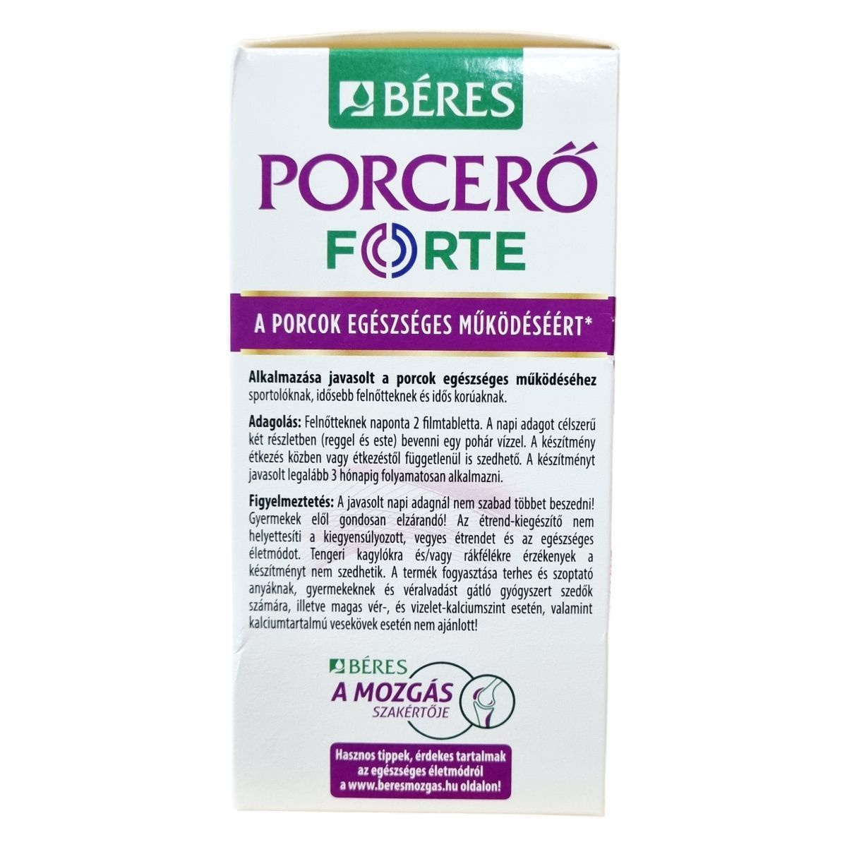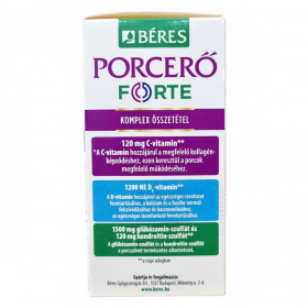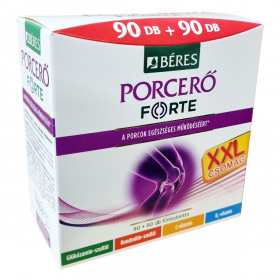 Béres Porceró FORTE filmtabletta komplex étrend-kiegészítő készítmény, mely C- és D3-vitamin, glükózamin-szulfát, valamint kondroitin-szulfát összetevőket tartalmaz, amelyek a napi adagban a porcszövet természetes alkotórészei és hozzájárulhatnak a porcok megfelelő működéséhez. A C-vitamin hozzájárulhat a megfelelő kollagénképződéshez, mely révén a porcok egészségesek maradhatnak. A D-vitamin támogathatja az egészséges csontozat fenntartását, a kalcium és foszfor normál felszívódását, valamint az izomfunkciók fenntartását. A készítmény ajánlott sportolók, idősebb felnőttek és idős korúak számára a porcok egészséges működésének segítésére. A doboz 90 db + 90 db 1,785 grammos filmtablettát tartalmaz. Tárolása száraz helyen, legfeljebb 25 °C-on javasolt. Hasznos tippek és további információk az egészséges életmódról elérhetők a gyártó mozgás szakértője oldalán.