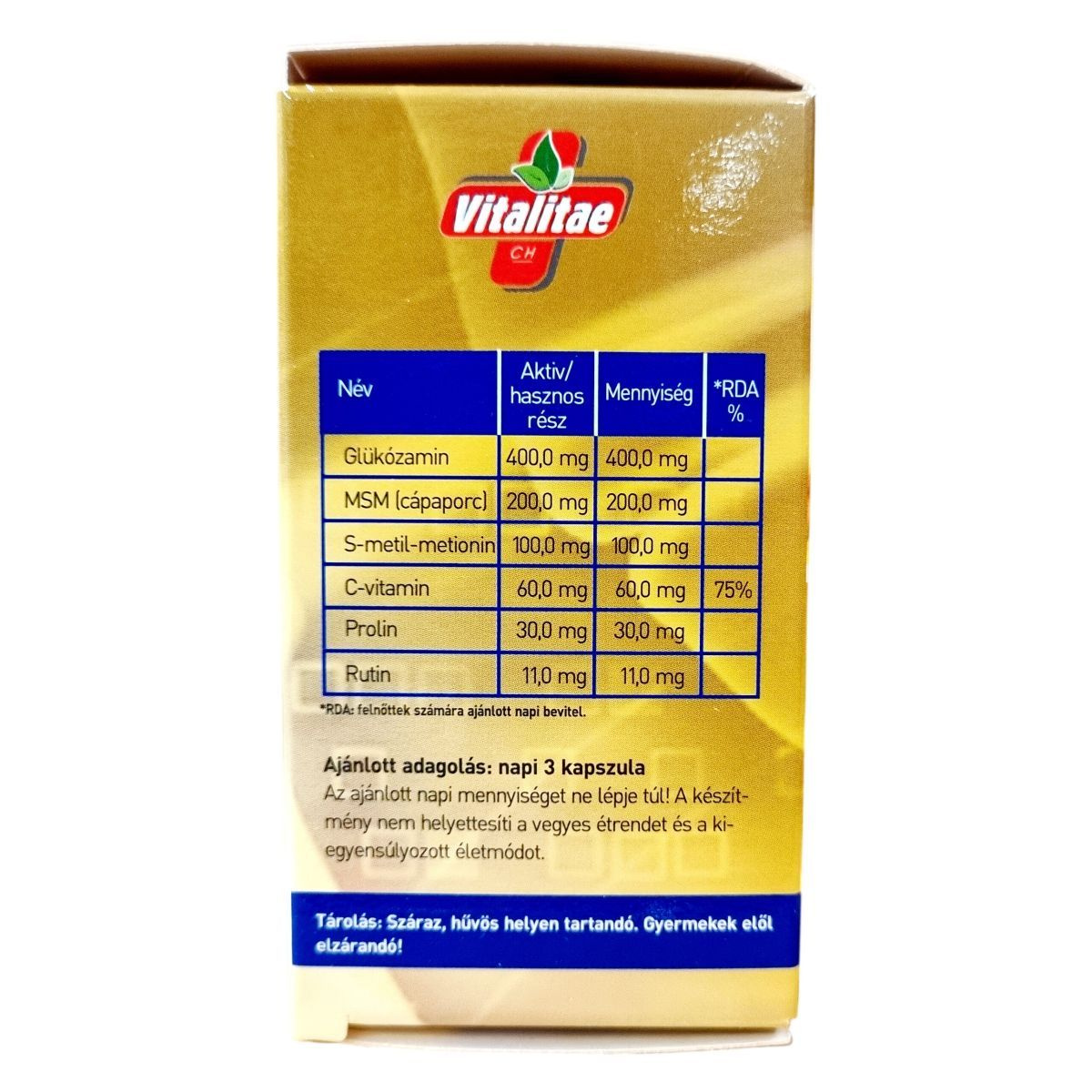 A Revitacart komplex kapszula fő összetevői között szerepel a metil-szulfonilmetán és a glükozamin, amelyek elősegíthetik a porc egészséges szerkezetének megőrzését és hozzájárulhatnak az ízületek normál működéséhez és mozgékonyságához. A glükozamin a porcszövet természetes alkotórésze glükozaminoglikán formájában, amely segítheti a porcszövetek és az ízületek egészséges működését. A magnézium szükséges a csontok és fogak normál szerkezetének fenntartásához. A C-vitamin szerepet játszhat a kötőszövet megfelelő működésében és szerkezetének kialakításában, ezáltal segítheti az íny, a bőr, a csontok és a porc egészségének megőrzését, valamint hozzájárulhat a haj, a köröm és a bőr egészségének fenntartásához. A rutin elősegítheti a vérerek egészségének fenntartását. A kalcium szükséges a csontok és fogak normál szerkezetének fenntartásához, és hozzájárulhat az optimális csonttömeg eléréséhez és fenntartásához.