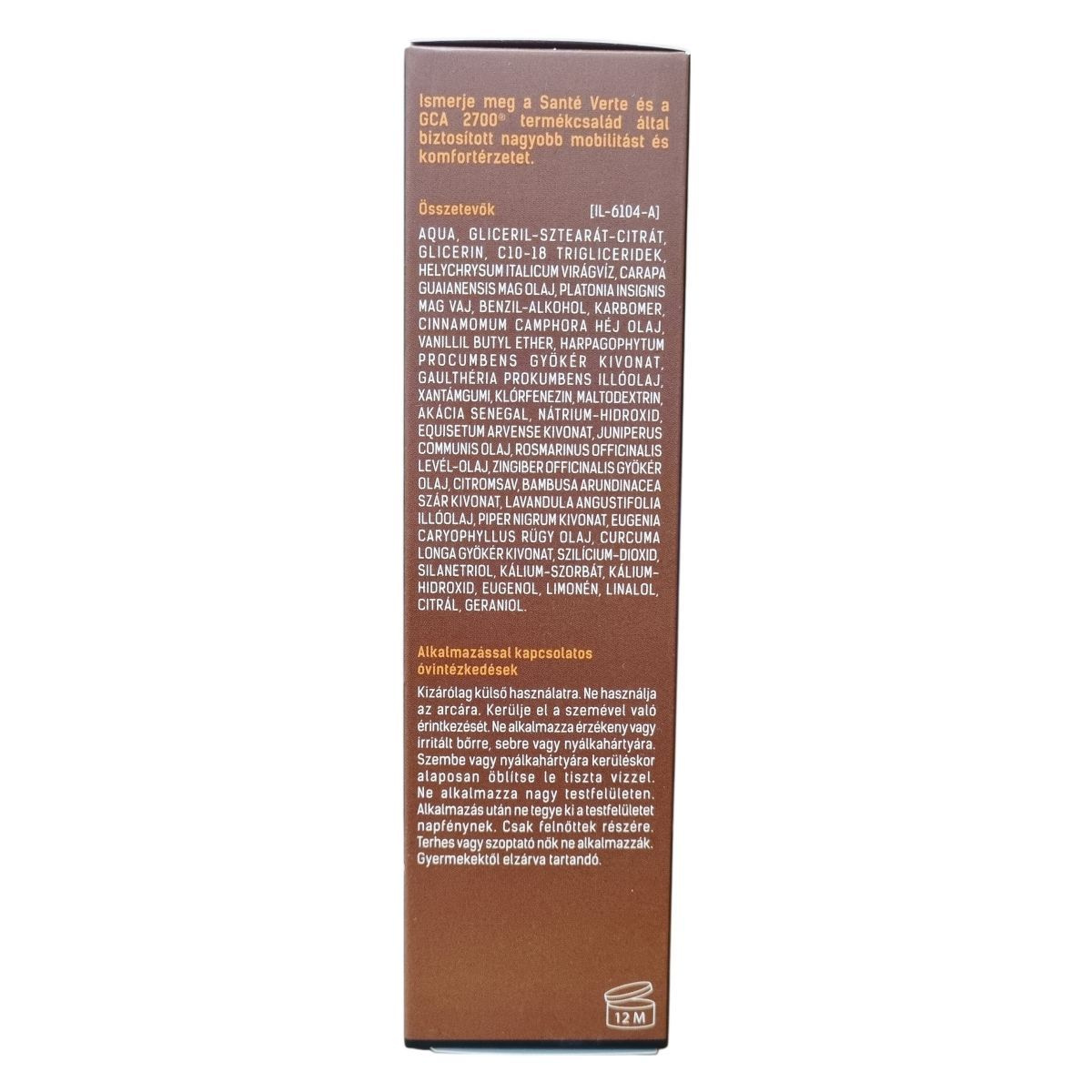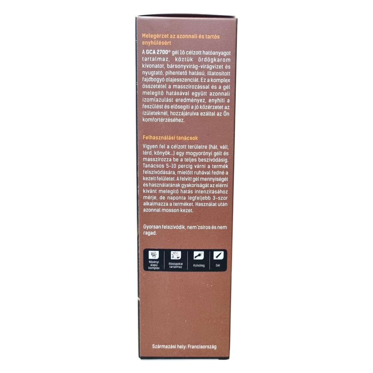 A GCA 2700® melegítő masszázs gél 16 különösen kiválasztott növényi összetevőt tartalmaz, melyek közül kiemelkednek a fajdbogyó olajesszencia, ördögkarom kivonat és a bársonyvirág-virágvíz. Ezek a természetes anyagok együtt segítik elő az izomlazulást és az ízületi feszültség enyhítését a masszírozó mozdulatokkal kombinálva, miközben kellemes meleg érzetet biztosítanak. A gél gyorsan felszívódik, nem hagy zsíros vagy ragacsos nyomot, illatosított és növényi alapú komplexe révén hozzájárul a test komfort és rugalmasság érzetének javításához. Használata során ügyeljen a megfelelő mennyiség alkalmazására, és kövesse a használati utasításokat a hatékony és biztonságos eredmény érdekében. A termék Franciaországban készült és a Santé Verte márka minőségét képviseli.