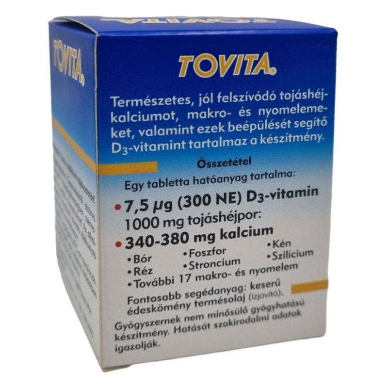 A csonttömeg megőrzése szempontjából kritikus élethelyzetekben - terhesség, szoptatás, változókor, rendszeres sportolás, csonttörés, csontritkulás - különösen fontos a megnövelt mennyiségű kalcium fogyasztása. A tabletta szedése ellenjavallt vesekőképződés, veseelégtelenség, gyomorsavhiány, mellékpajzsmirigy túlműködés, D-vitamin túladagolás esetén. A Tovita csonterősítő tabletta tojáshéjból készül. Jól felszívódó formában tartalmazza az emberi szervezet számára szükséges életfontosságú ásványi anyagokat.