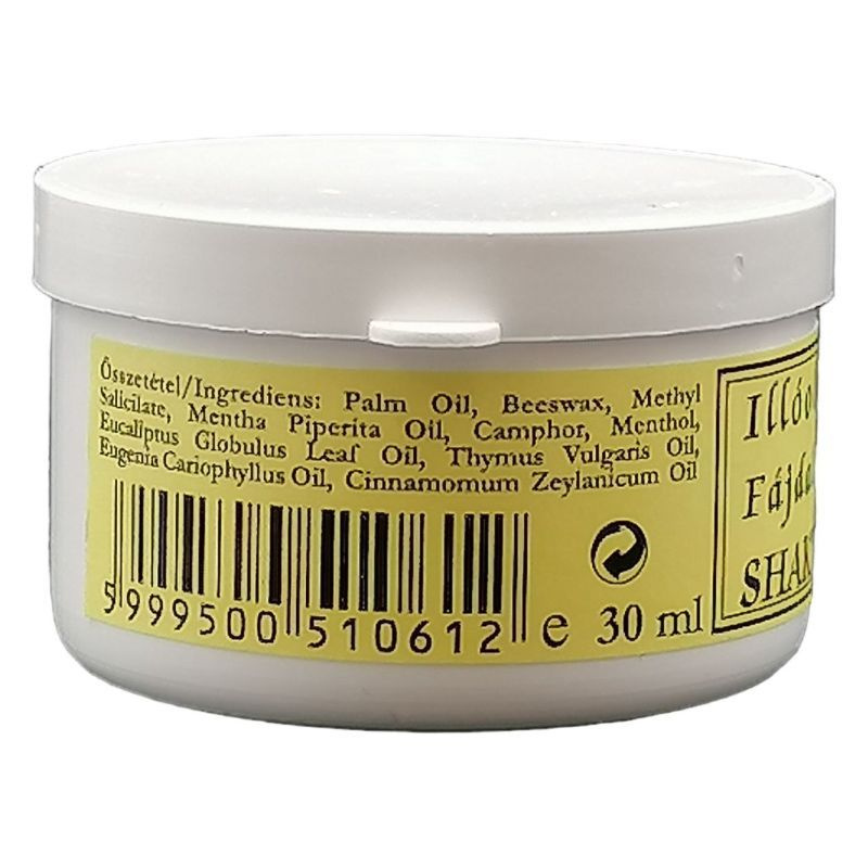 Összetevők: eukaliptusz, borsmenta, szegfűszeg, levendula illóolajok, kakukkfű olaj, fahéj olaj, metil-szalicilát, kámfor, mentol, sárga méhviasz, pálmazsír.